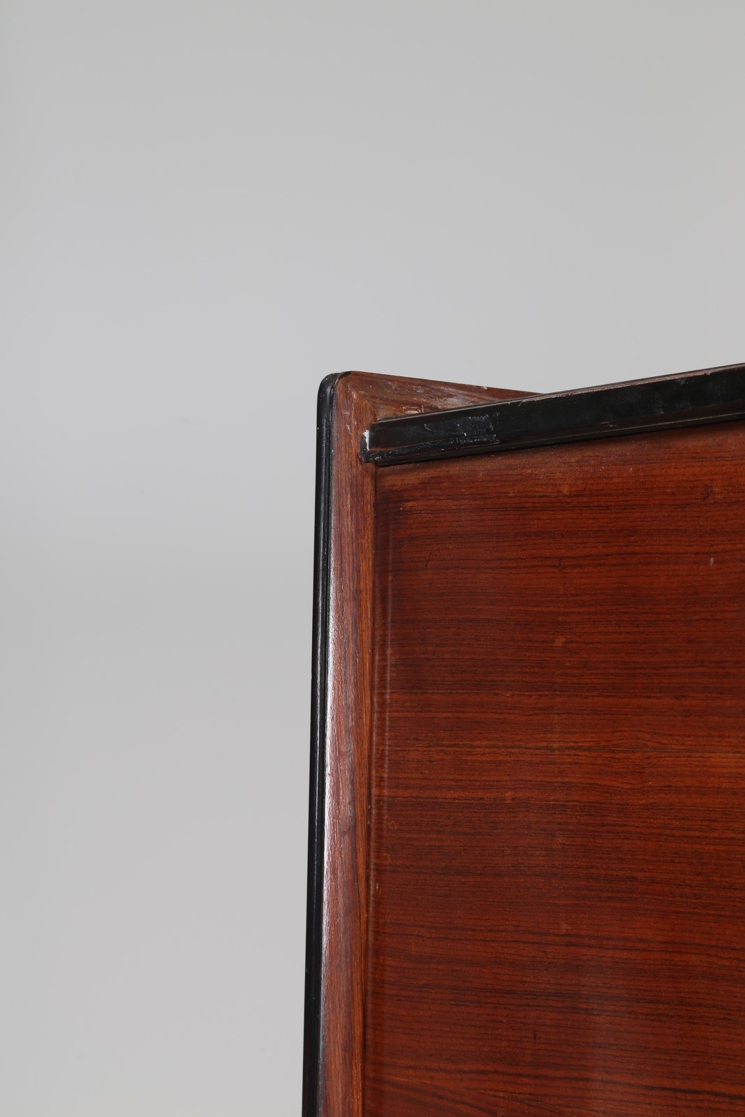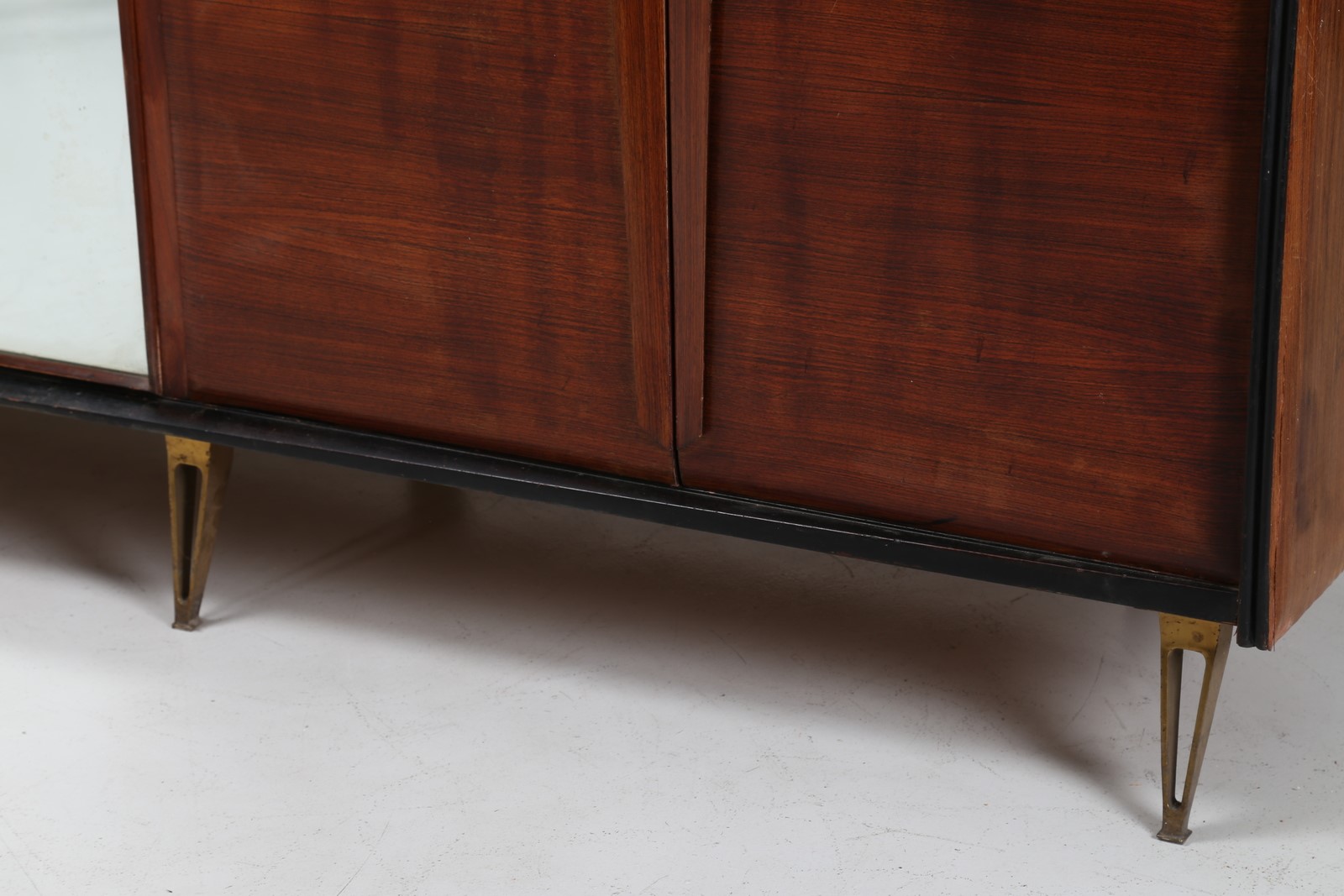 ITALIAN MANUFACTURE Wardrobe. Wood, brass, glass. Cm 313,00 x 191,50 x 64,00. Six-door rosewood frame, legs and details in brass and mirror. 50s.