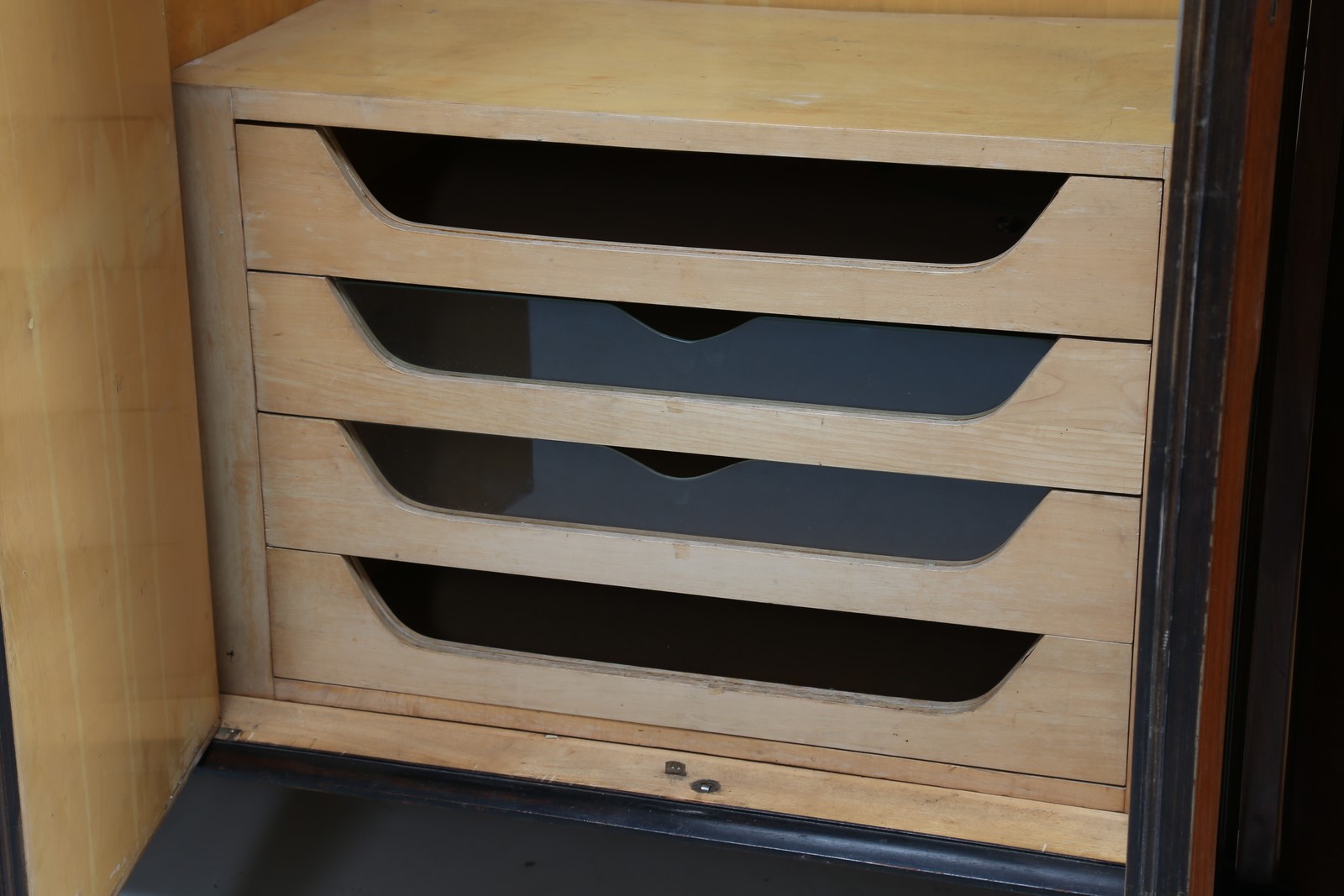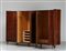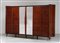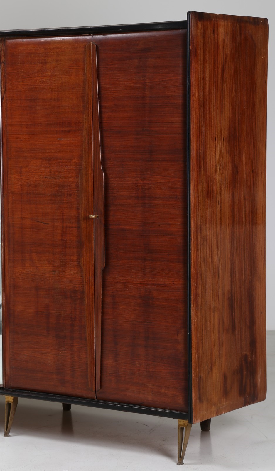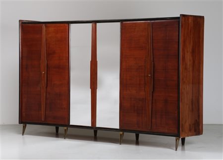 MANIFATTURA ITALIANA Armadio . Legno, ottone, vetro. Cm 313,00 x 191,50 x 64,00. Struttura a sei ante in legno di palissandro,gambe e dettagli in ottone e specchio. Anni 50.