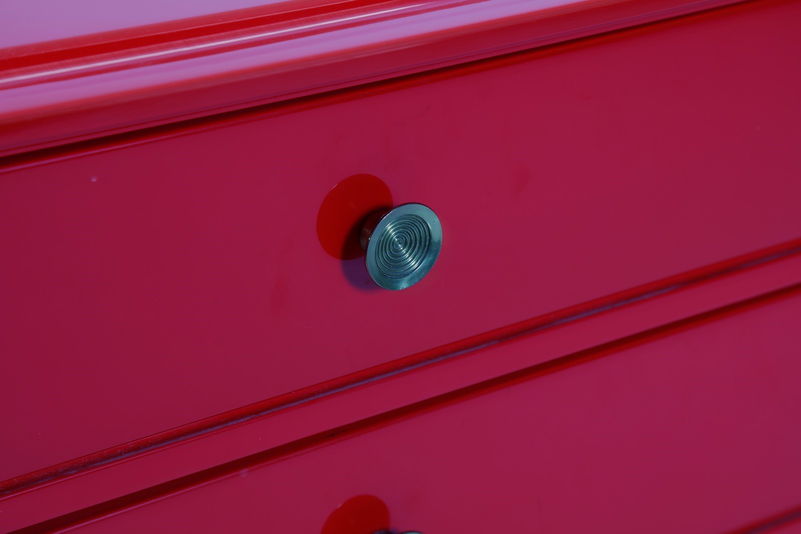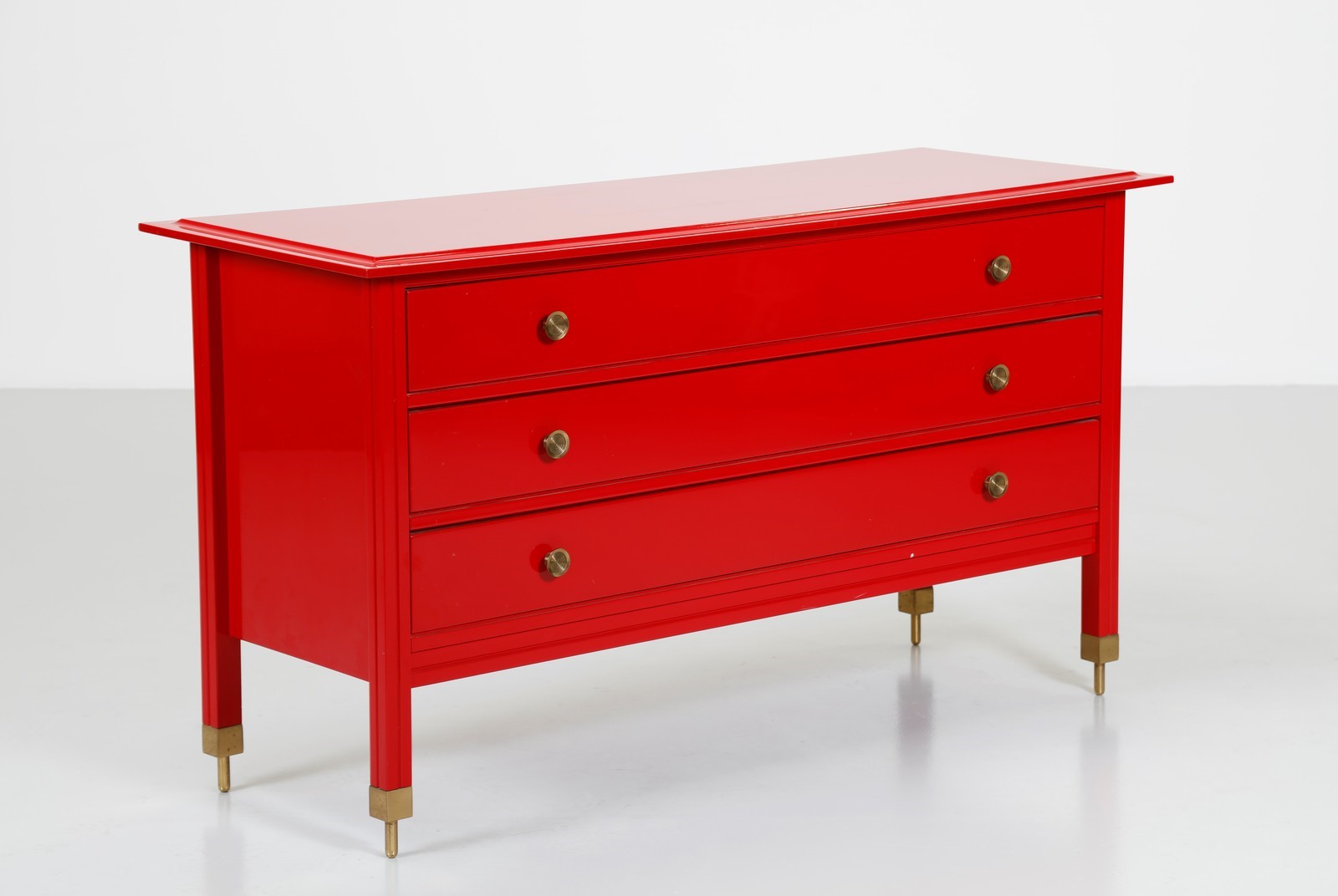 DE CARLI CARLO (1910 - 1999) Cassettiera. Legno laccato e ottone. Cm 143,00 x 80,00 x 50,00. Struttura in legno laccato rosso, maniglie e puntali in ottone. Modello D154, per Sormani, 1963.