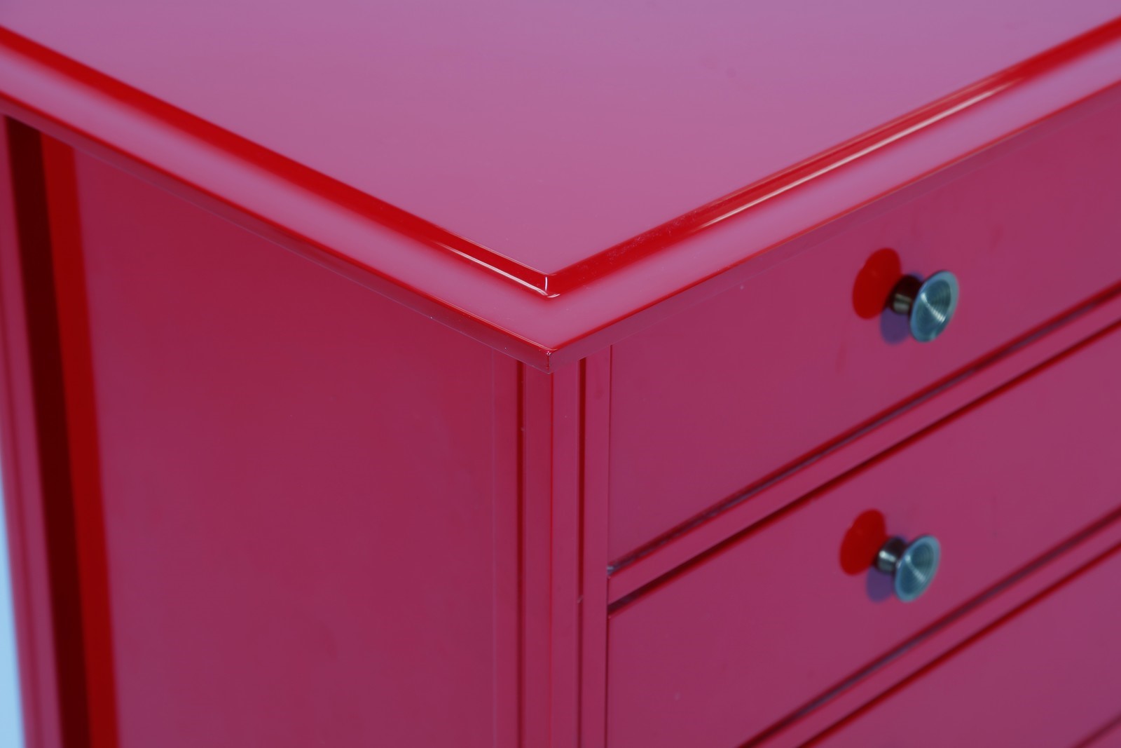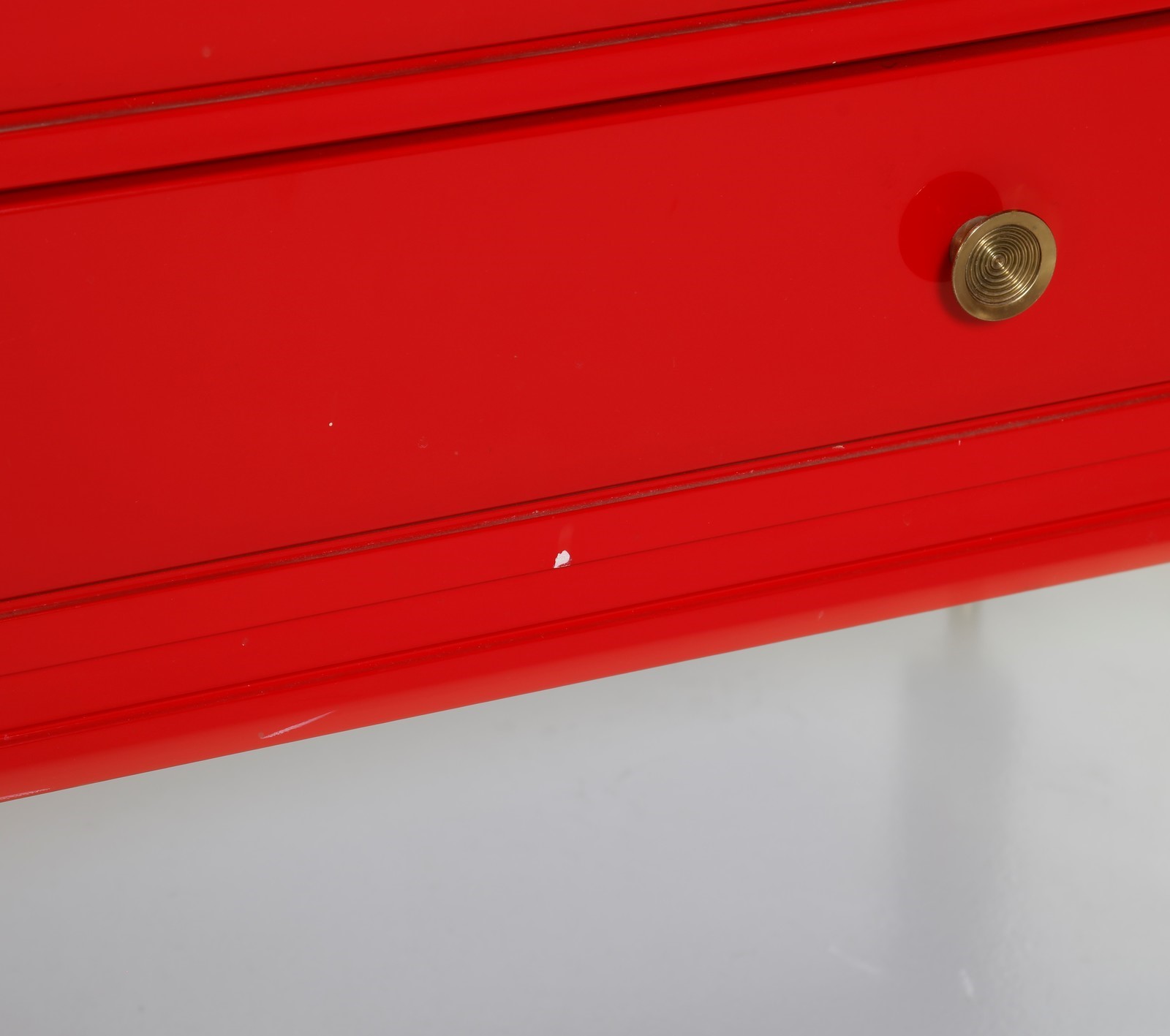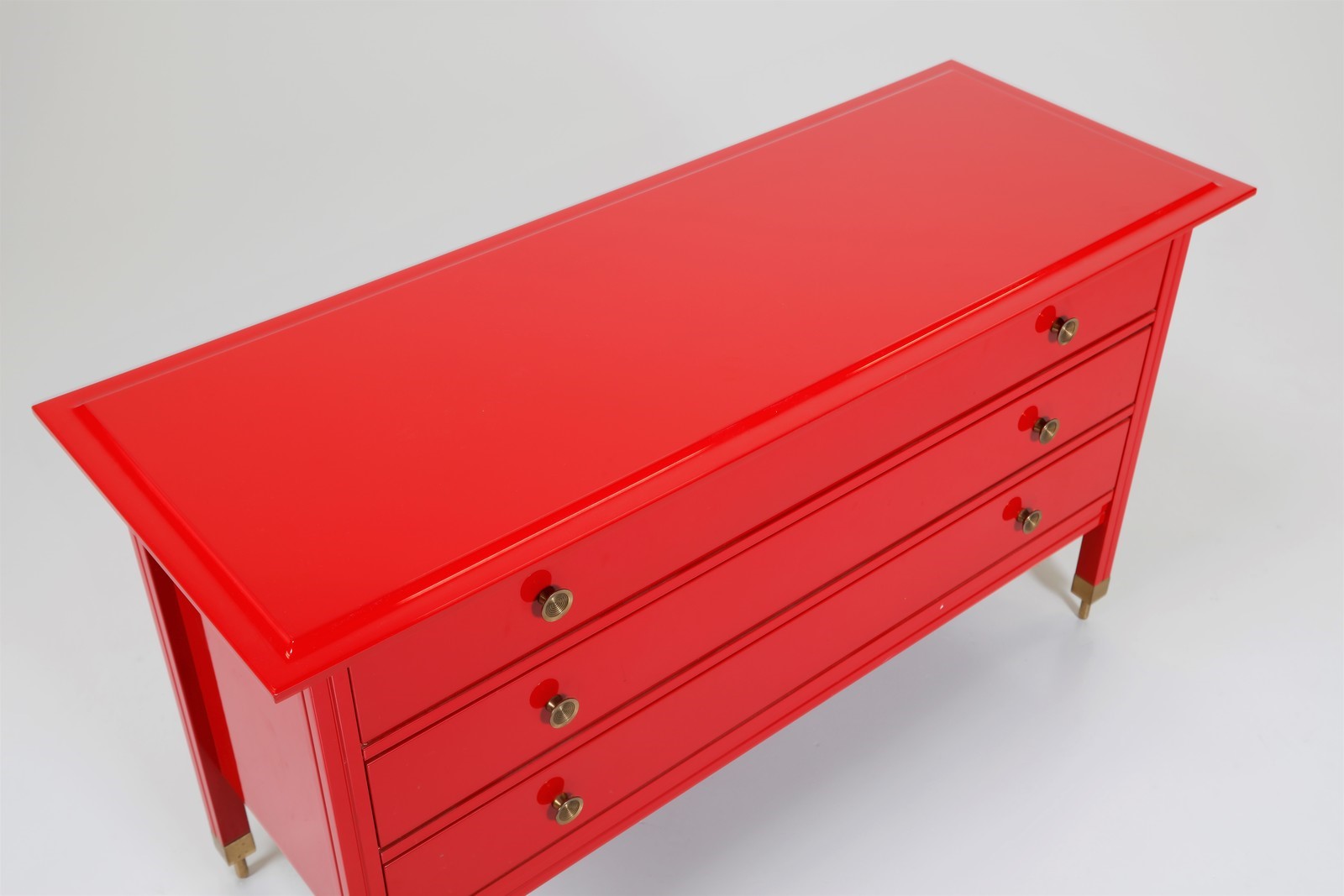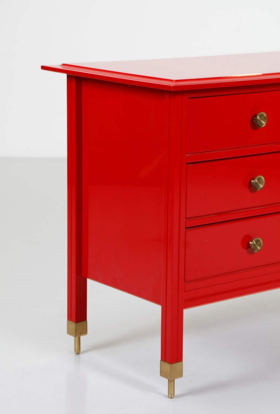 DE CARLI CARLO (1910 - 1999) Chest drawers. Lacquered wood and brass. Cm 143,00 x 80,00 x 50,00. Red lacquered wooden frame, handles and ferrules in brass. Model D154, for Sormani, 1963.