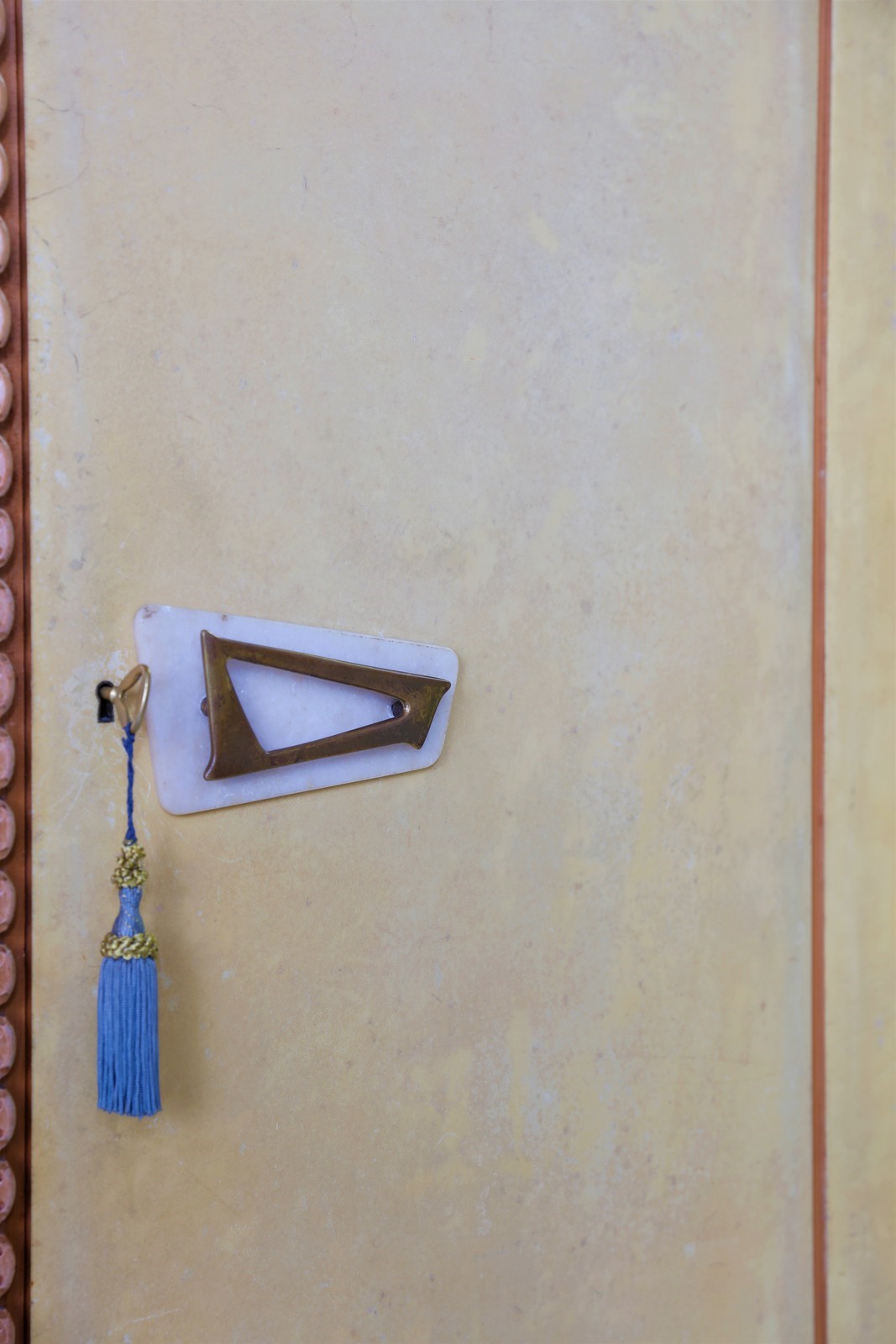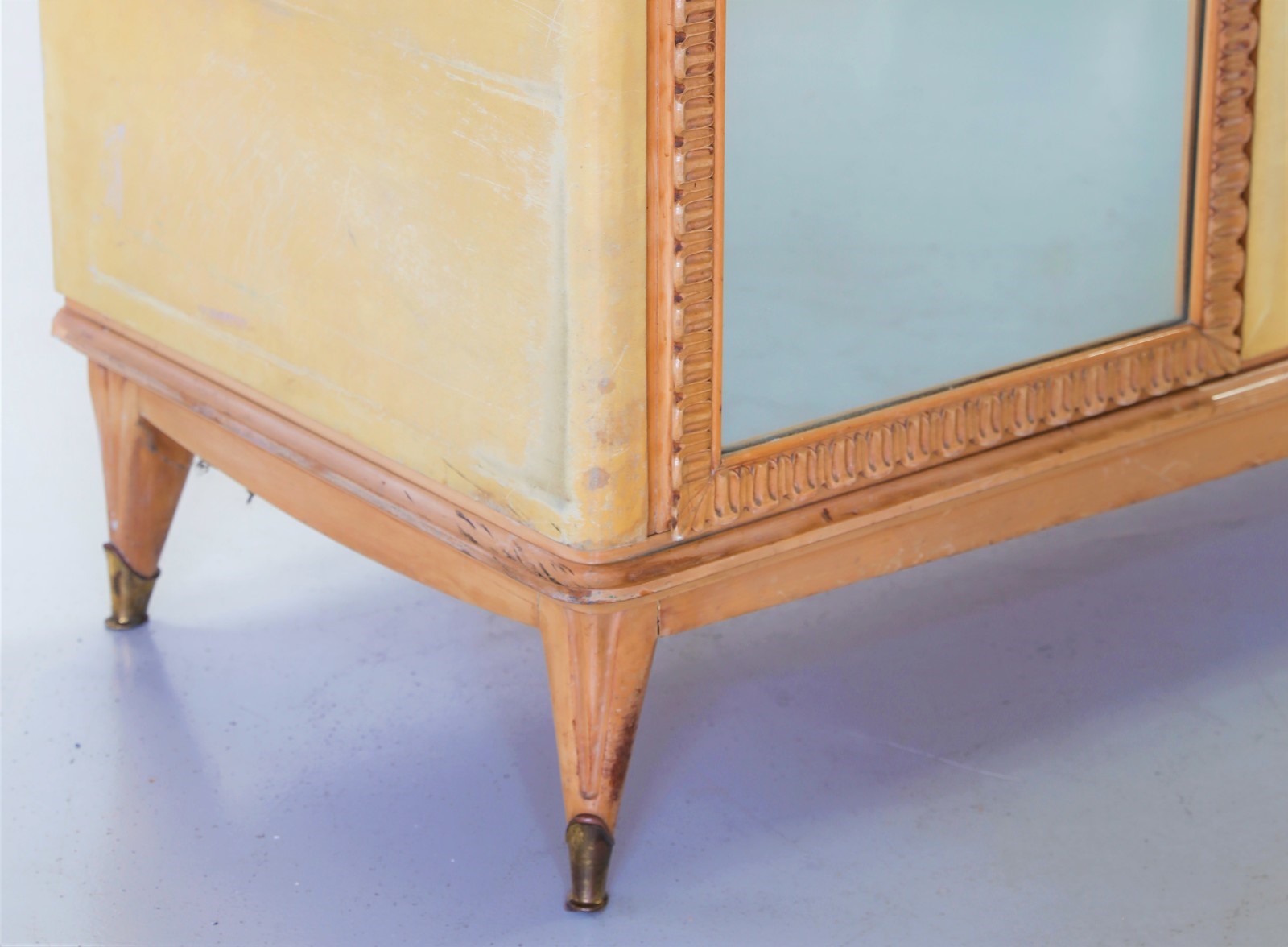 ANZANI MOBILI Wardrobe. Parchment, glass and brass. Cm 303,00 x 271,00 x 62,00. Structure completely covered in parchment, details of onyx and brass handles, mirrors. 50s.