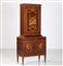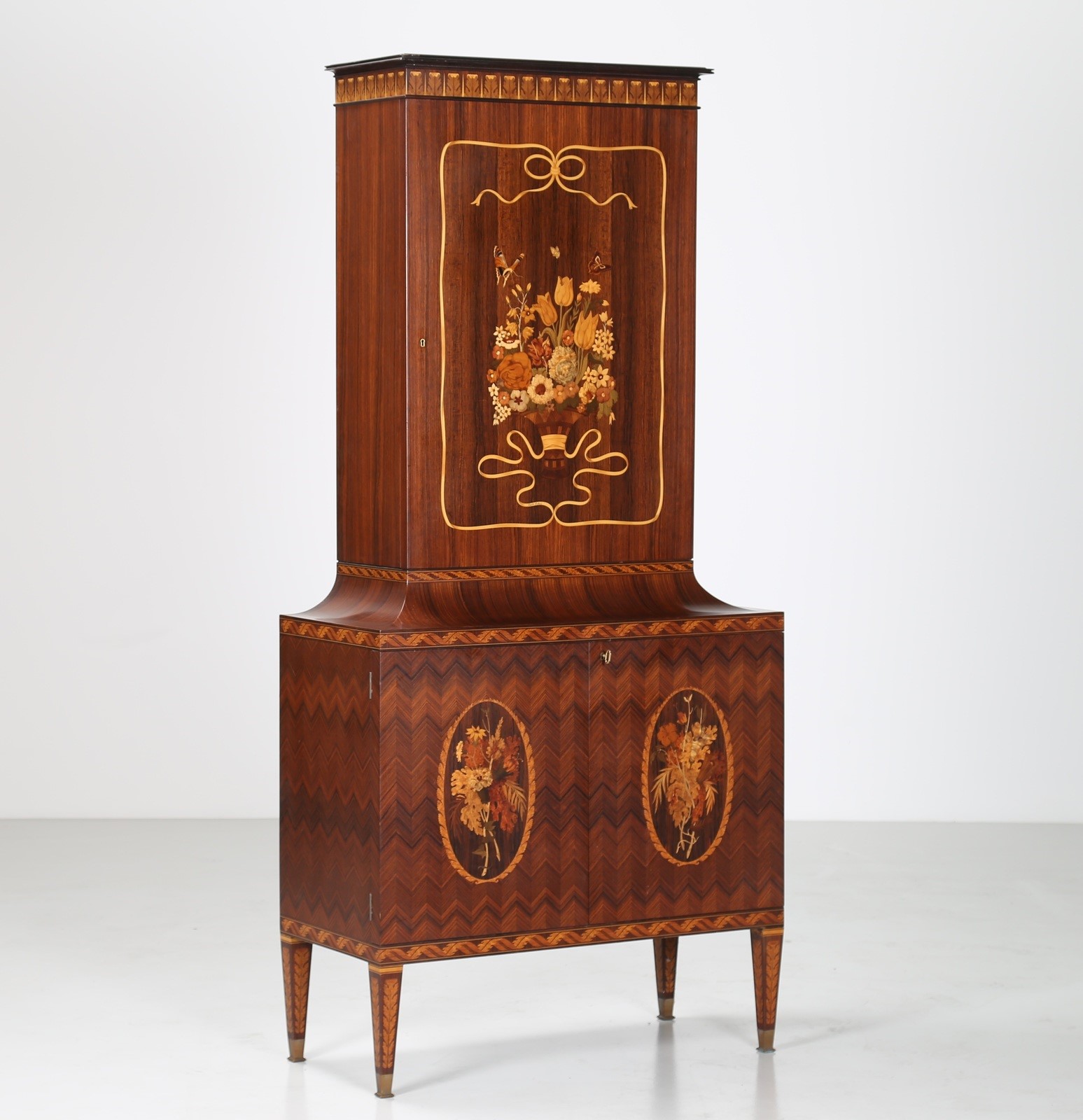 ANZANI CARLO Trumeau. Legno. Cm 92,00 x 200,00 x 42,00. Struttura in legno intarsiato in varie essenze. Esecuzione Giovanni Anzani e Figli, Mariano Comense Como anni 40. Firma presente su porta centrale. Pubblicazioni; Domus, n. 151, luglio 1940, p. 80, (esempi opere).