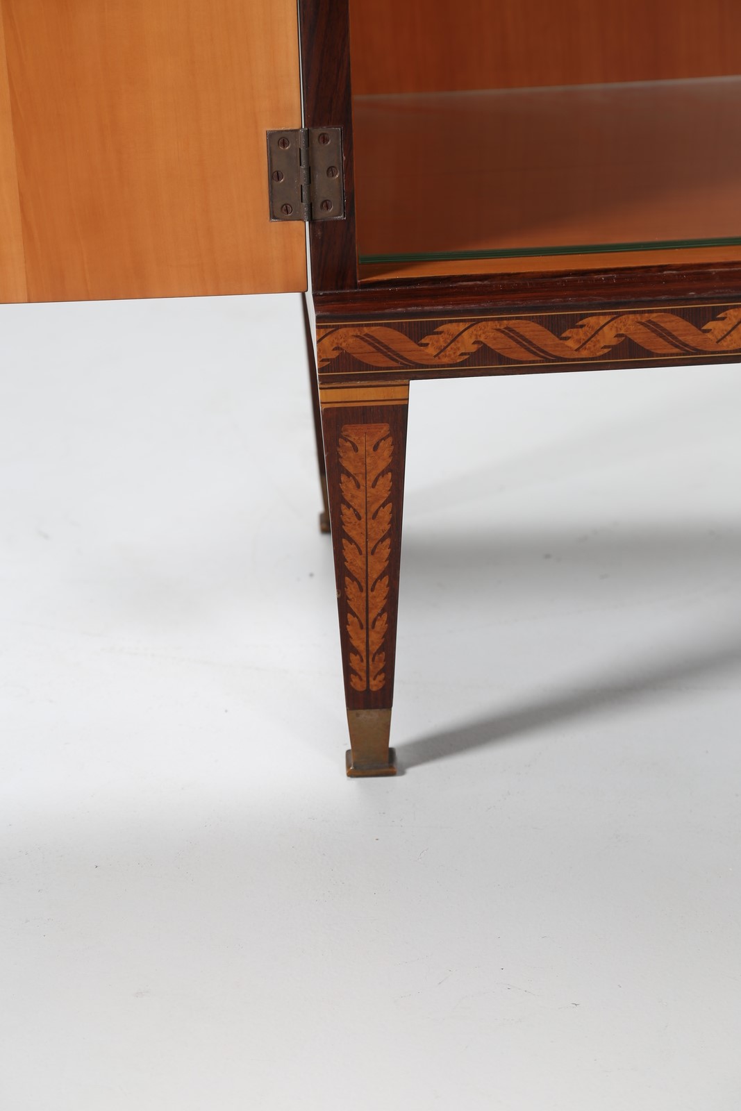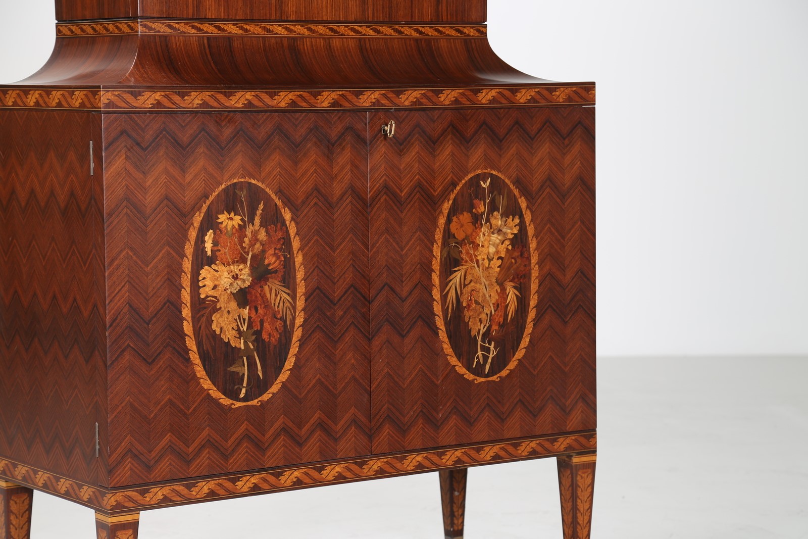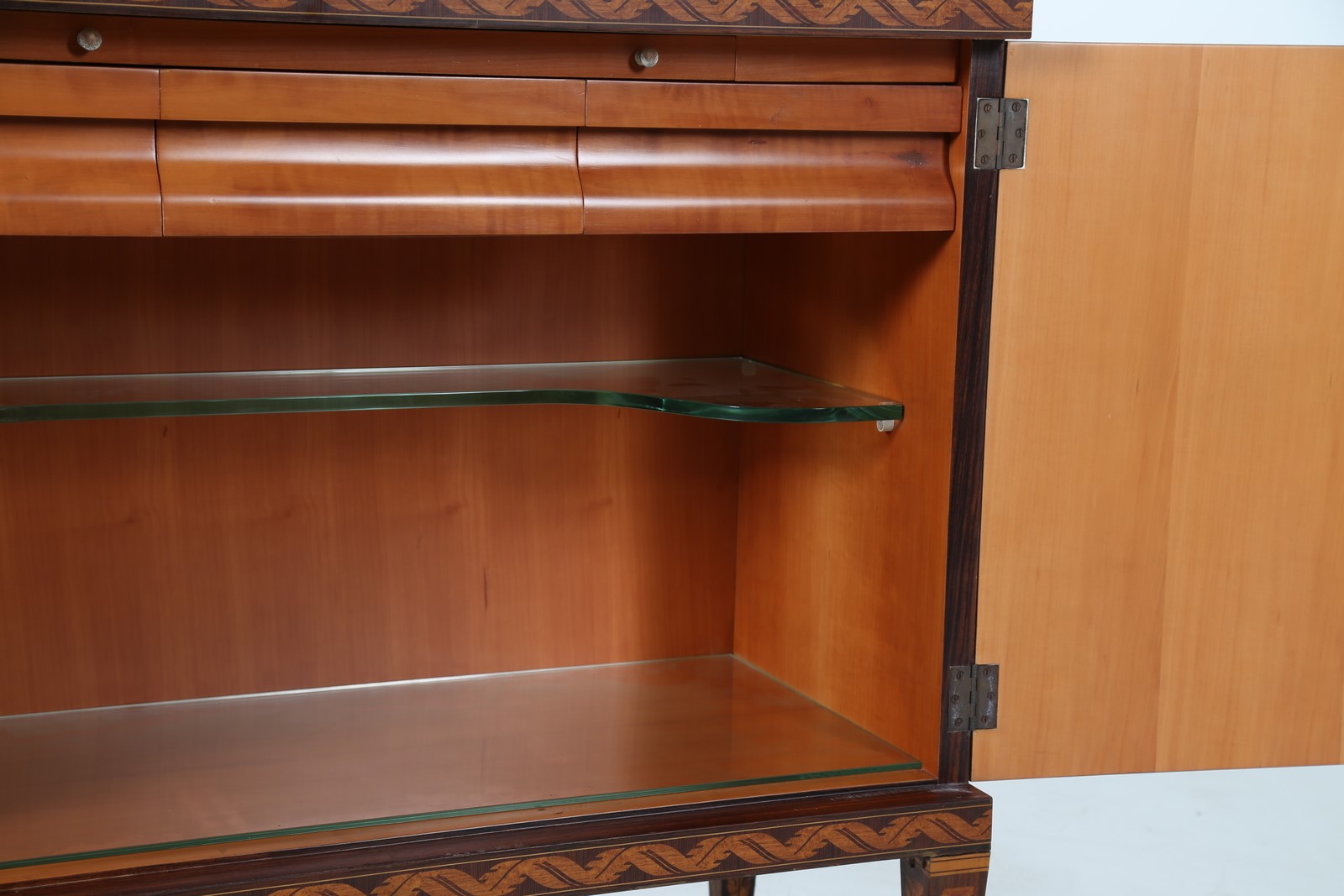 . Wood. Cm 92,00 x 200,00 x 42,00. Inlaid wooden structure in various essences. Execution Giovanni Anzani and Figli, Mariano Comense Como 40 years. Signature present on central door. Publications; Domus, n. 151, July 1940, p. 80, (examples of works).