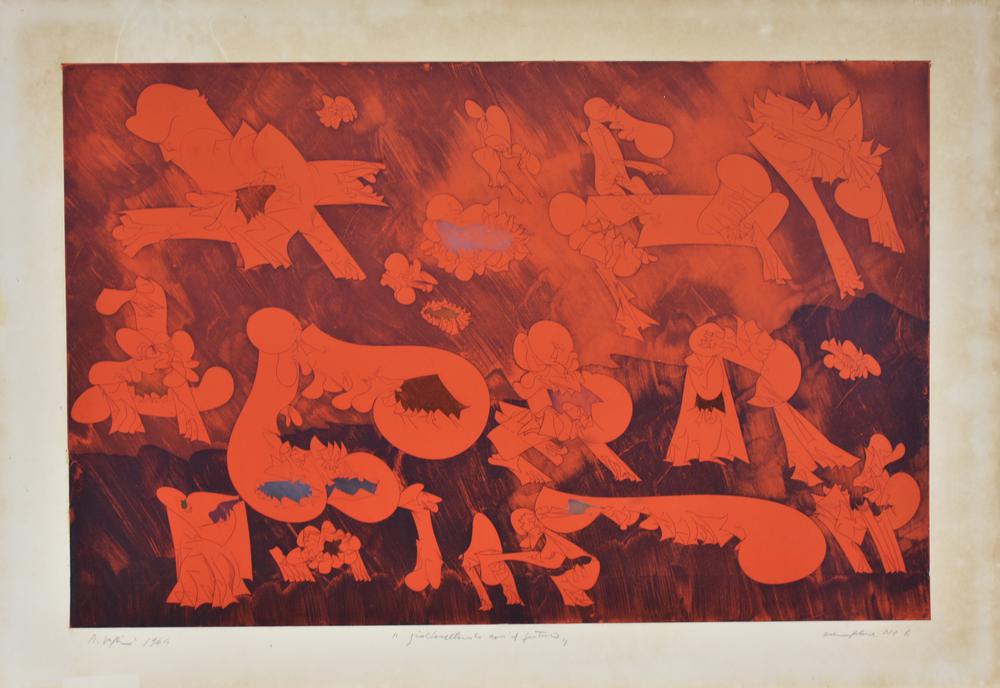 Renato Volpini GIOCHERELLANDO CON IL FUTURO incisione su carta, cm 68x98 (lastra cm 54,3x83,5) esemplare 6 sul fronte: firma, titolo e data eseguita nel 1964 L'opera presenta diffuse macchie di umidità