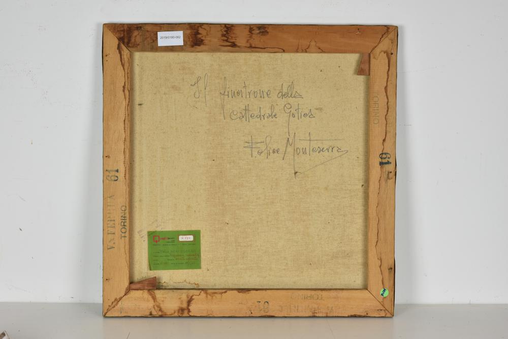 Felix Monteserra IL FINESTRONE DELLA CATTEDRALE GOTIER tessuto colorato, cm 61x61 sul fronte: sigla sul retro: firma e titolo L'opera presenta tracce di umidità ai margini