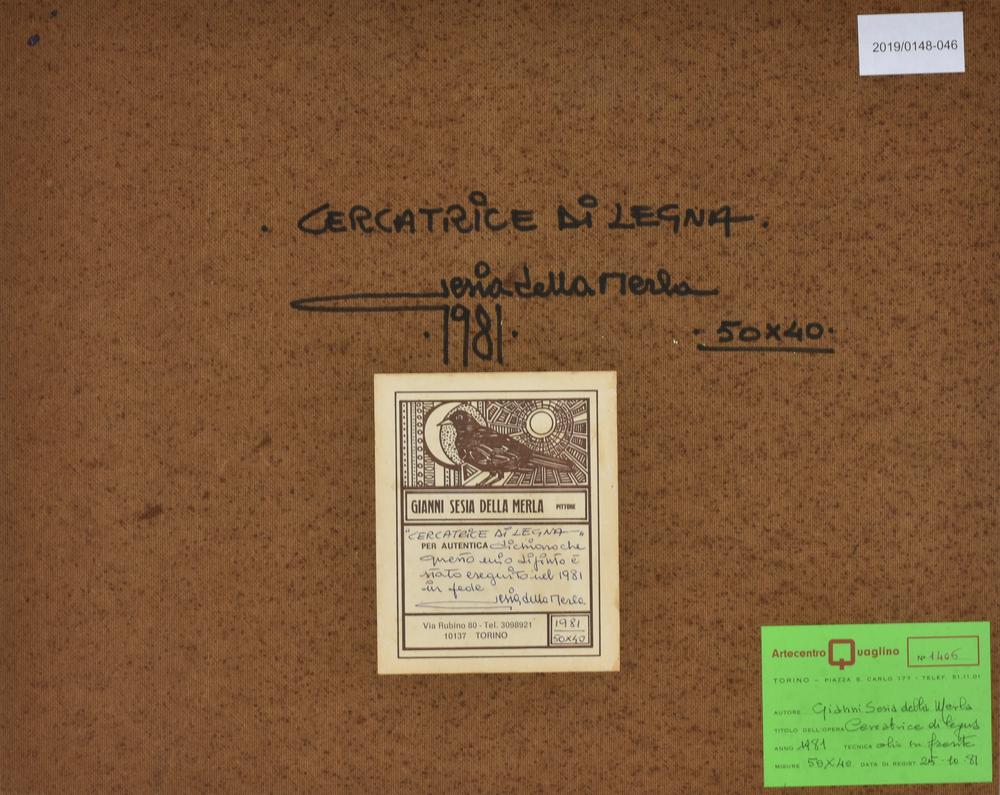 Gianni Sesia della Merla CERCATRICE DI LEGNA olio su faesite, cm 40x50 sul fronte: firma sul retro: firma, titolo e data eseguito nel 1981