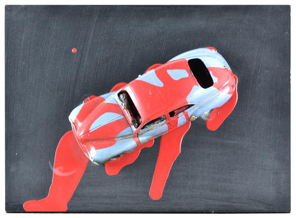 Bernard Aubertin VOITURE BRULEE' modellino di macchina bruciata applicata su tavola, cm 40x30 sul retro: firmato e datato eseguito nel 2010 L'opera è accompagnata da autentica dell'Archivio Opere Bernard Aubertin su fotografia