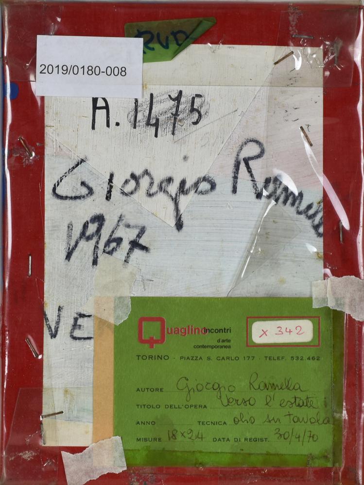 Giorgio Ramella VERSO L'ESTATE olio su tavola, cm 24x18 sul fronte: firma e data sul retro: firma, titolo e data eseguito nel 1967