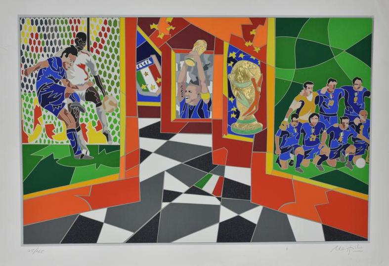 Ugo Nespolo IL CALCIO serigrafia e collage su carta, cm 57,5x88 esemplare 45 su 125 sul fronte: firma