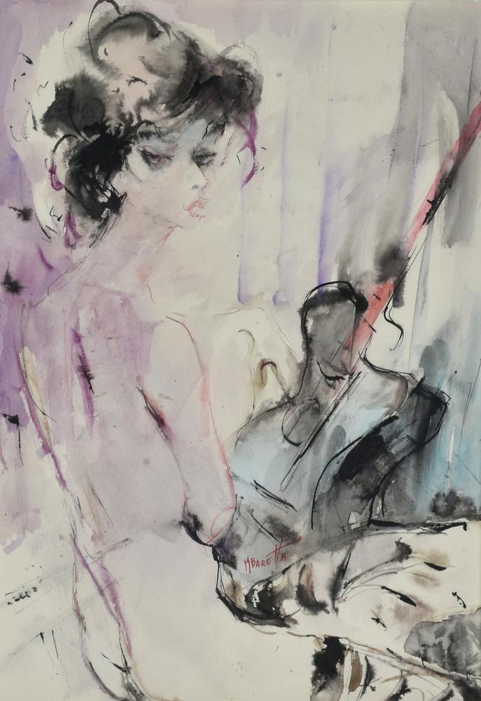 Michele Baretta DONNA CON CHITARRA tecnica mista su carta, cm 34x24 sul fronte: firma