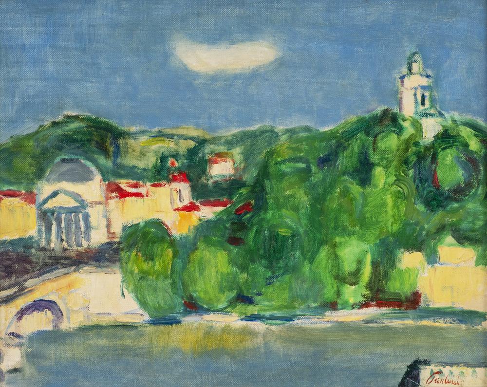 Enrico Paulucci TORINO, GRAN MADRE E IL MONTE DEI CAPPUCCINI olio su tela, cm 40x50 sul fronte: firmato sul retro: timbro della Collezione Giorgio Mossa sul telaio