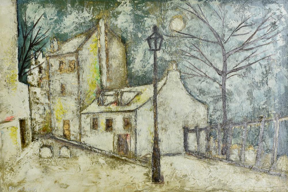 Bruno Landi MONTMARTRE (PARIGI) olio e smalto su cartone con foglia d'oro, cm 41x60 sul fronte: firma sul retro: autentica dell'artista