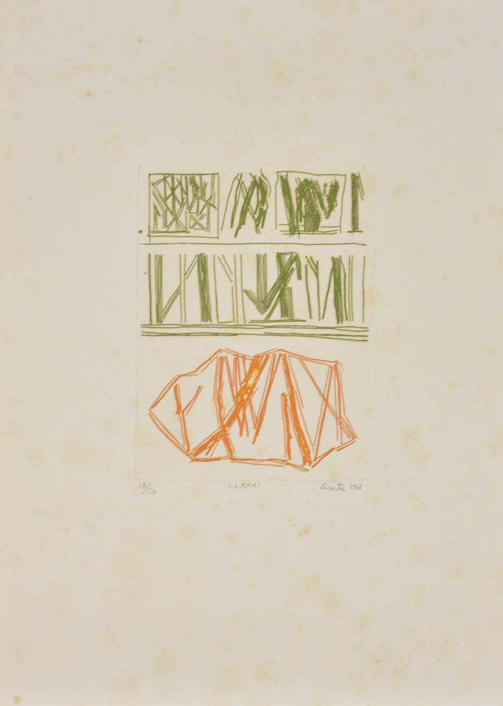 Riccardo Licata CLXXXI acquaforte su carta, cm 45x33 (lastra cm 19,5x15) esemplare 18 su 50 sul fronte: firma, titolo e data eseguita nel 1966 L'opera presenta diffuse macchie di umidità
