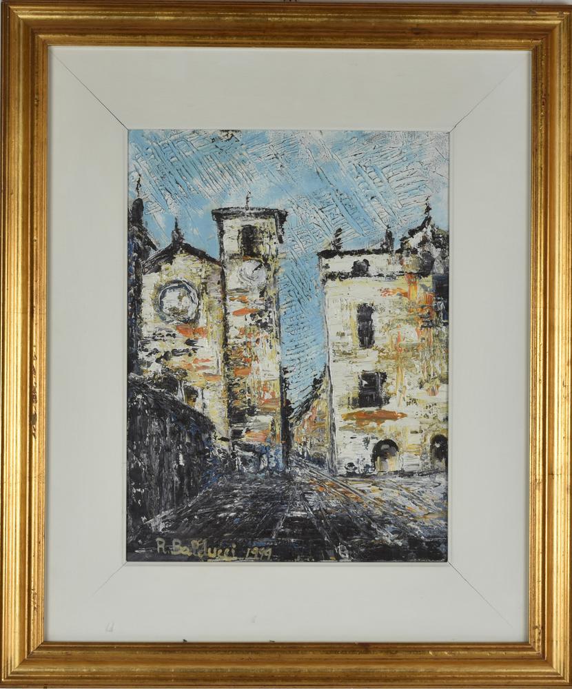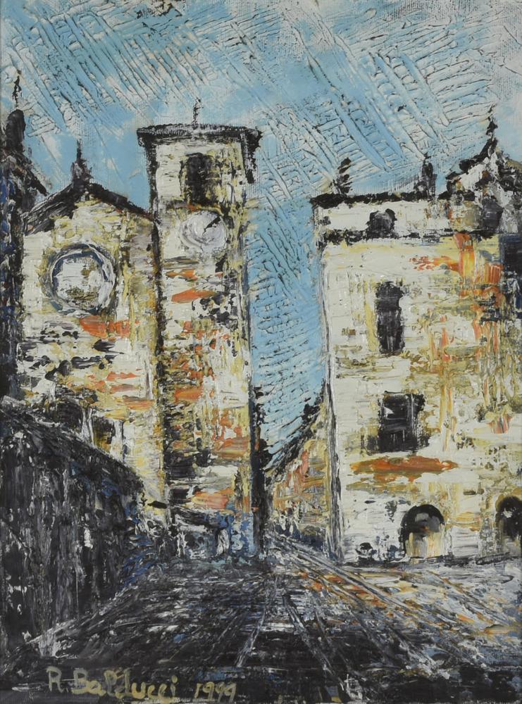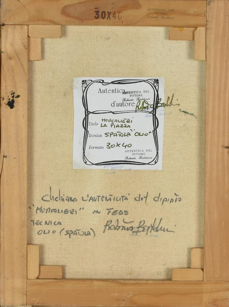 Roberto Balducci MONCALIERI, LA PIAZZA olio su tela, cm 40x30 sul fronte: firma e data sul retro: firma, titolo ed autentica dell'artista al retro eseguito nel 1999