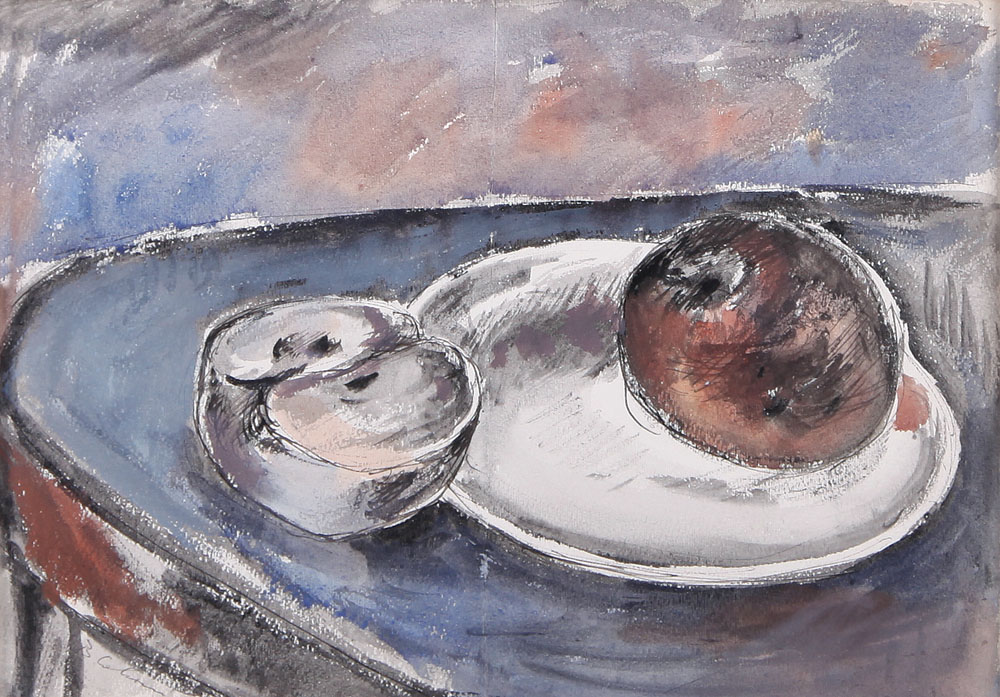BRUNO CALVANI Mola di Bari 1904 - Milano 1986 Natura morta china e tempera acquerellata su cartoncino cm. 30x42, firma in basso a sinistra.