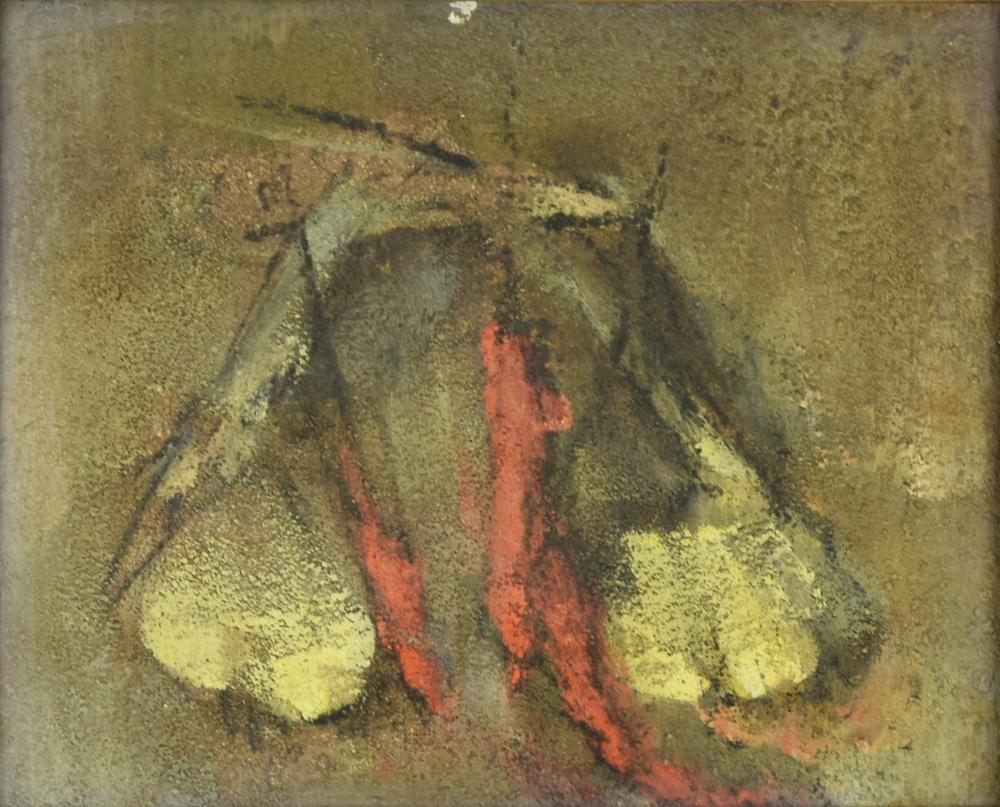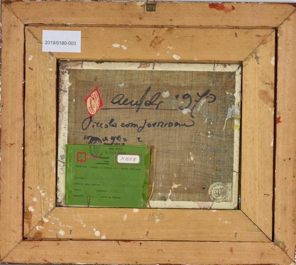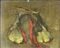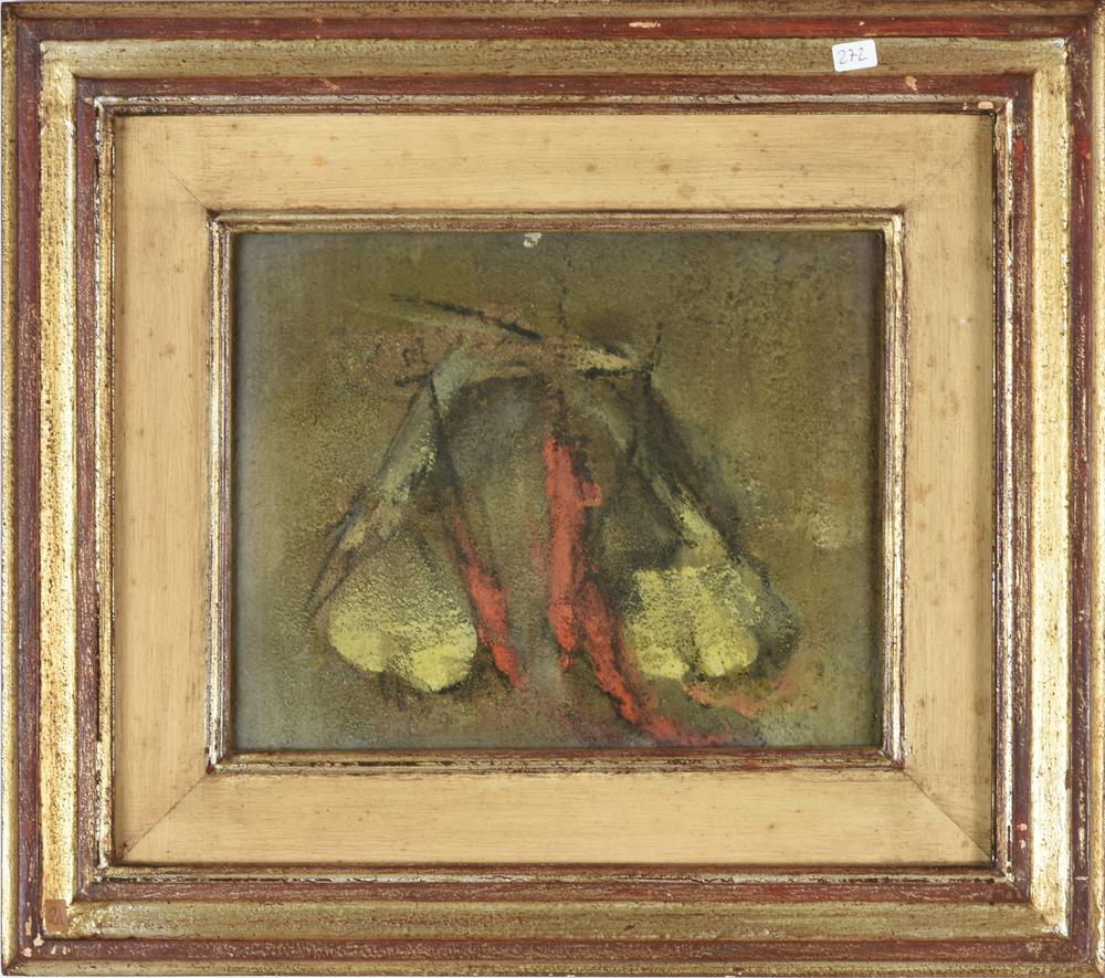Audoli Maria Teresa PICCOLA COMPOSIZIONE CON AGLIO E PEPERONCINI olio su cartone telato, cm 20x25 sul retro: firma, titolo e data eseguito nel 1970