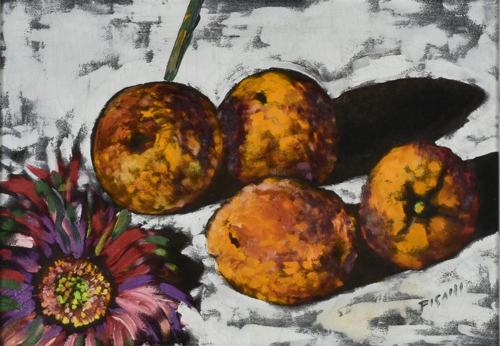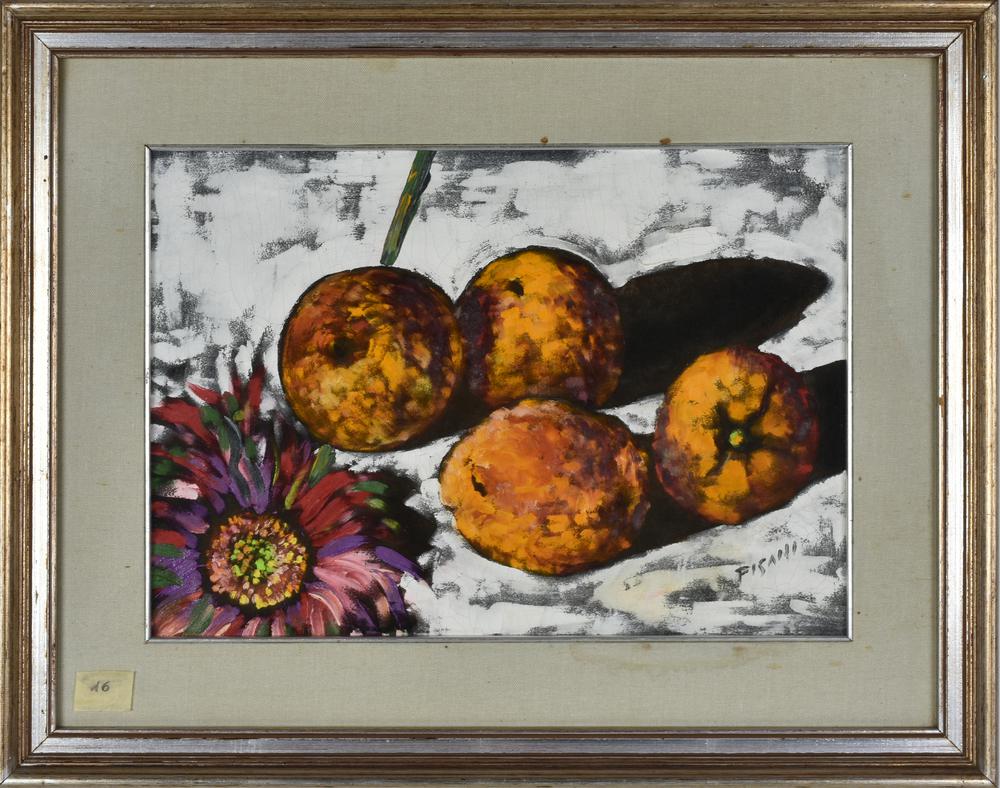 Pisani FRUTTA E FIORI NELLA NEVE olio su cartone, cm 36x50 sul fronte: firma