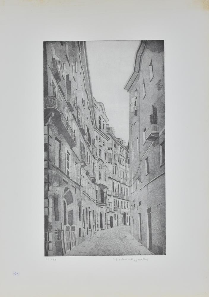 Galli Federica QUADRILATERO incisione su carta, cm 70x50 (lastra cm 49,5x28) esemplare 74 su 99 sul fronte: firma L'opera presenta diffuse macchie di umidità ai margini