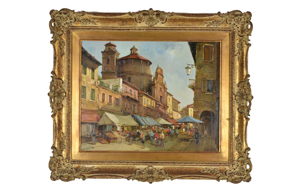 Francisetti Gilberto BANCARELLE PRESSO CHIESA DI SAN ROCCO A CARMAGNOLA olio...