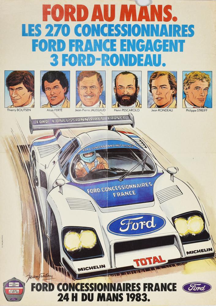 MANIFESTO FORD AU MANS 1983 cm 57x40,5 Manifesto originale della partecipazione della Ford alla 24 Ore di Le Mans del 1983. Creazione Jean Graton, R.C. Versailles Mancanza al margine superiore ORIGINAL POSTER 22 7/16 x 15 15/16 in