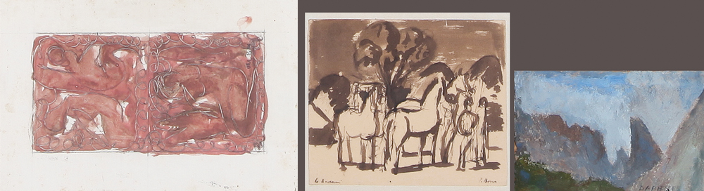 AUTORI VARI ANGELO DEL BON Cariatidi, 1940 tempera acquerellata su carta cm. 17x9, firma in basso a destra, etichetta della Galleria Annunciata (MI) al retro. POMPERO BORRA Le amazzoni tecnica mista su carta cm. 11,5x14, firma in basso a destra, titolo in basso a sinistra, verbale di perizia della Finarte (MI) su foto. DAPHNE CASORATI MAUGHAM Paesaggio montano olio su cartoncino cm. 9x14, firma in basso a destra.