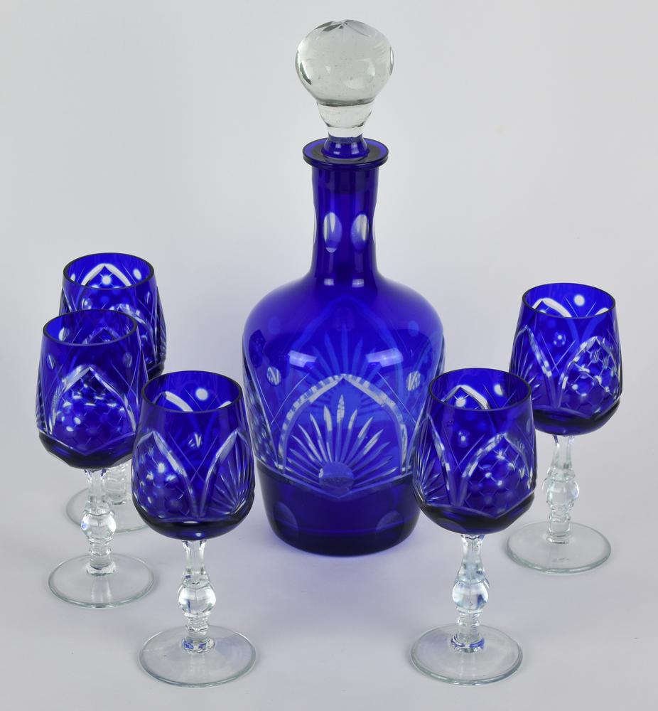 SERVIZIO IN CRISTALLO DI BOEMIA Servizio da liquore in cristallo blu e bianco composto da bottiglia e 5 bicchieri Boemia, prima metà XX secolo bottiglia h cm 29, bicchieri h cm 15 Lievi difetti