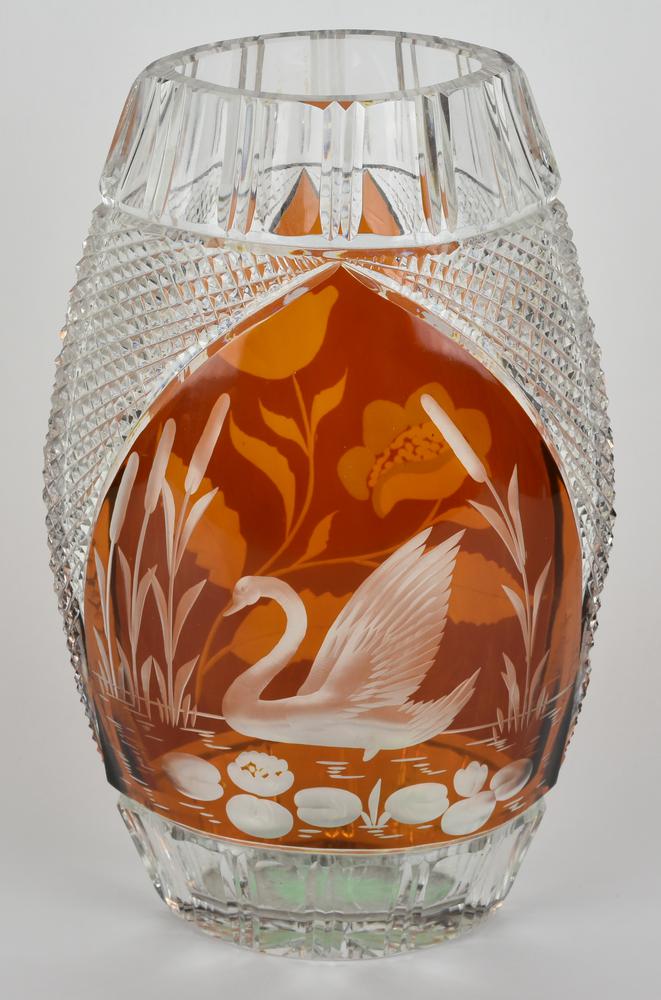 VASO IN CRISTALLO DI BOEMIA Vaso in cristallo nei colori bianco e arancio con decori incisi a motivi floreali e lacustri Boemia, metà XX secolo h cm 30