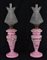 COPPIA DI LAMPADE AD OLIO IN VETRO Coppia di lampade ad olio in vetro opalescente di colore rosa dipinte con decorazioni a festoni di fiori e foglie, vetri satinati coevi incisi Francia, seconda metà XIX secolo h cm 66