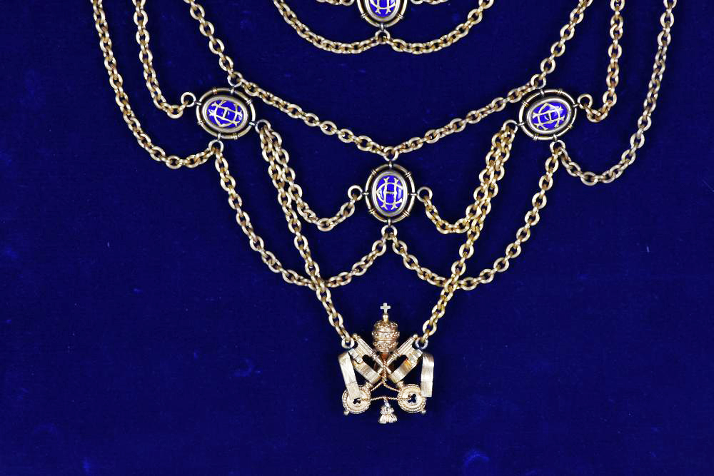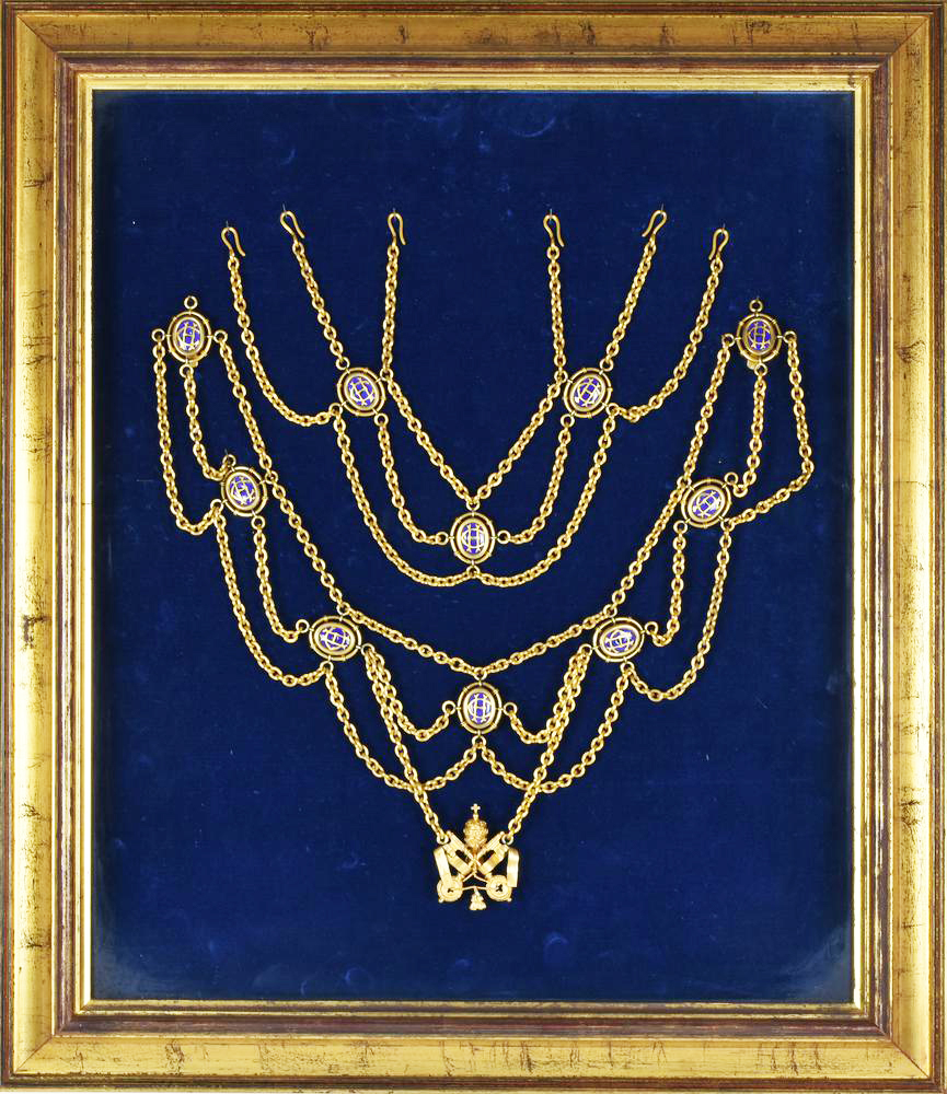 DECORAZIONE PONTIFICIA Particolare riproduzione in metallo dorato e smalti del Collare d'oro dei Gentiluomini di Sua Santità, detto anche Catenone Italia, seconda met? XX secolo cm 40x40