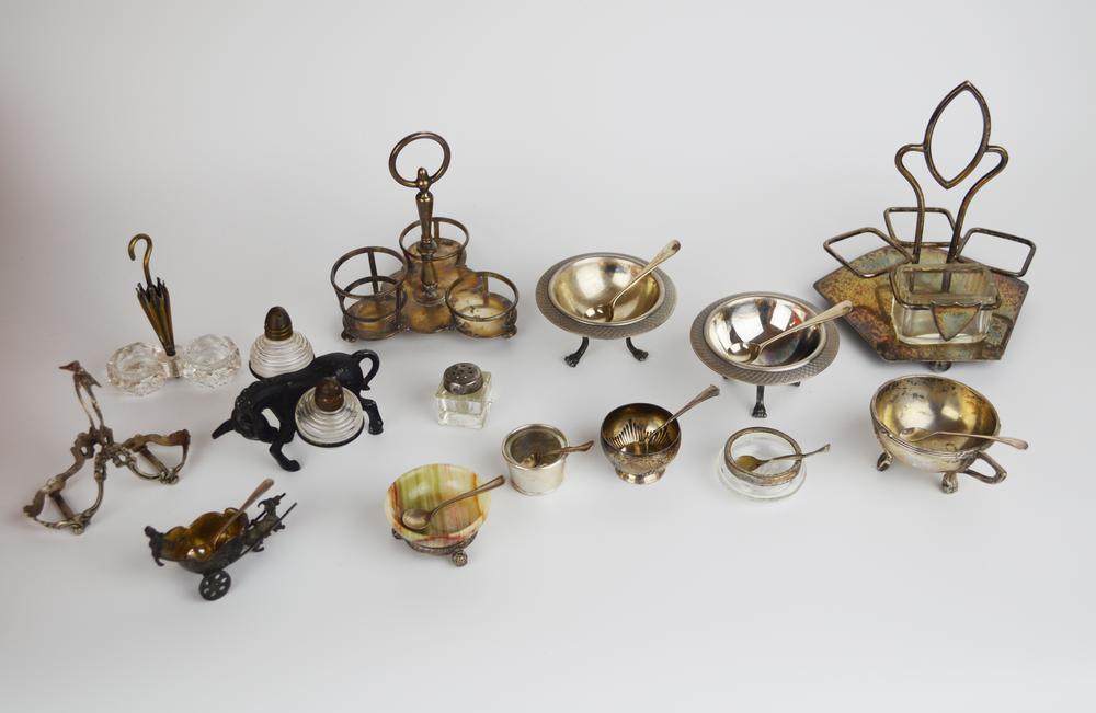 Lotto di saliere in metallo argentato: due saliere a tripode di gusto impero; una saliera a tazza su tre piedi; tre saliere circolari a vaschetta; una saliera a carro trainato da una capra; una saliera quadrangolare in vetro con tappo in metallo; una ad asinello col basto; una circolare in onice; una saliera doppia in vetro con presa ad ombrello; tre porta saliere privi dei contenitori, Secolo XX (14)