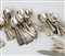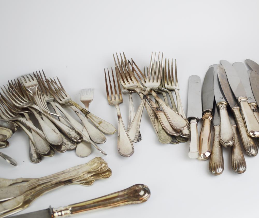 Lotto composto da 118 posate in metallo argentato: 1 coltello da arrosto 46 cucchiai grandi 10 forchette grandi 18 cucchiai da dessert 18 forchette da frutta 6 coltelli da pesce 11 coltelli grandi 8 cucchiaini Il lotto è composto da posate di modelli differenti