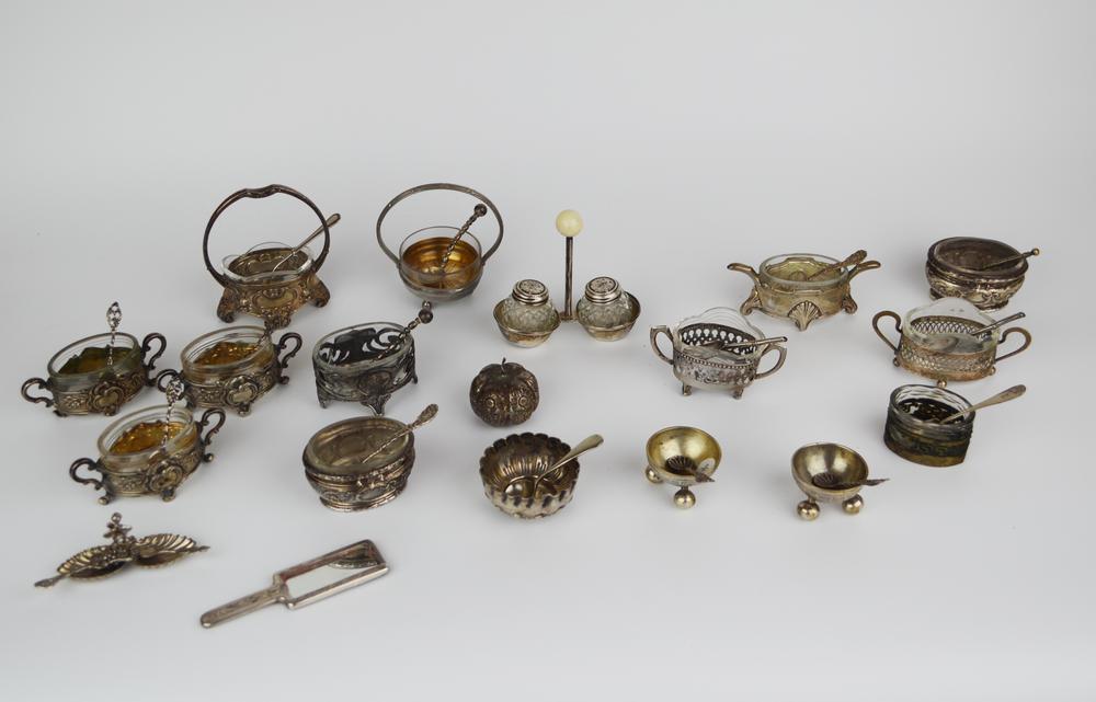 Lotto di saliere in argento e metallo argentato del secolo XX: tre saliere ovali a vaschetta di gusto ‘700 in argento; una saliera simile con alto manico in metallo argentato; due saliere ovali in metallo argentato; cinque saliere a vaschetta in metallo argentato; una a cestino; una saliera doppia a conchiglia sormontata da puttino; una coppia in metallo e vetro con porta saliere; una coppia in metallo argentato con piedi a sfera; una saliera circolare con bordo ondulato e una a piccola zucca; uno specchietto in argento (20)