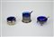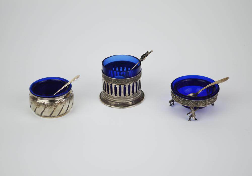 Tre saliere circolari in argento, una traforata, una con foglie stilizzate e una con piedini modellati a putto. Complete di cucchiaini e interno in vetro blu Italia sec. XX g 76