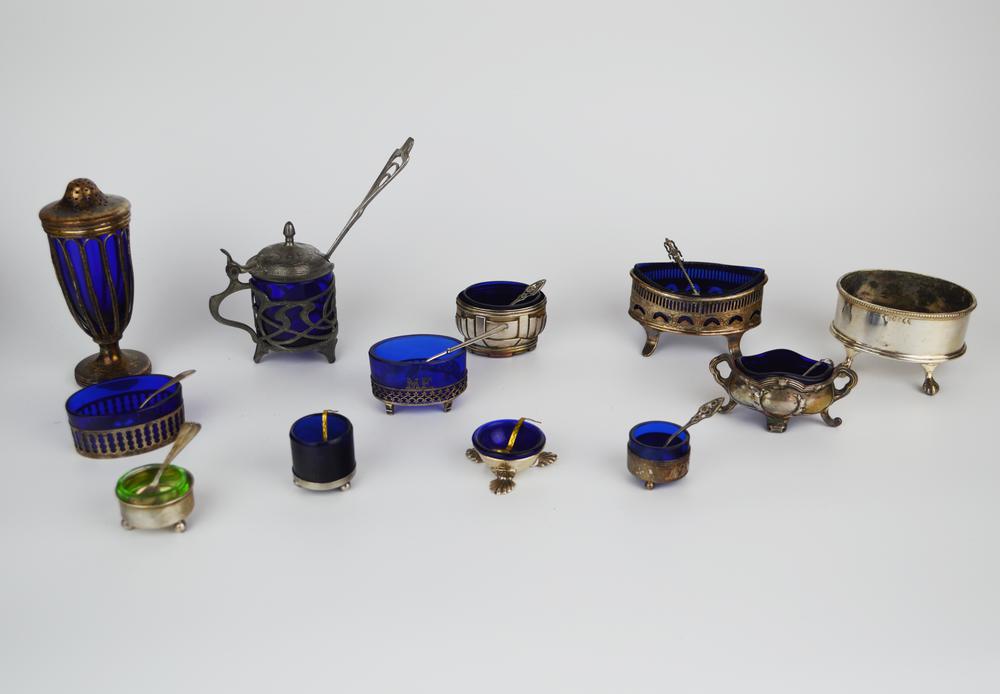 Lotto di saliere in argento e metallo argentato: otto saliere a vaschetta di forma ovale e circolare con interni in vetro blu ed una con interno in vetro verde; una senapiera liberty in peltro; una zuccheriera in metallo argentato e vetro blu; una vaschetta ovale priva del vetro. Completi di cucchiaini. (12)