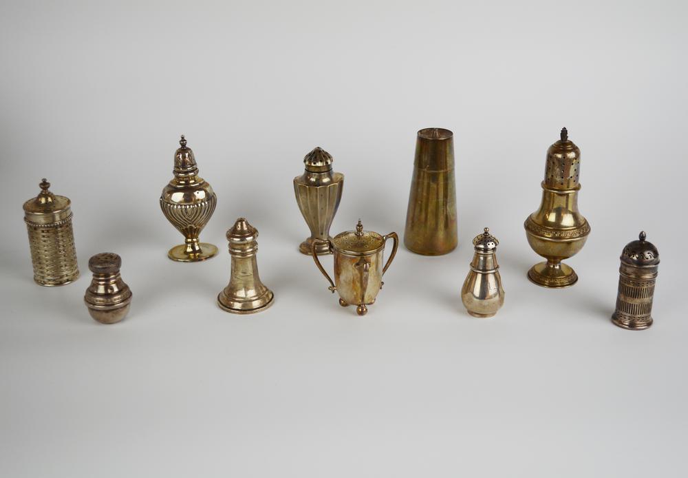 Dieci saliere di forma per lo più cilindrica con coperchio in argento; g 331;...
