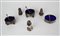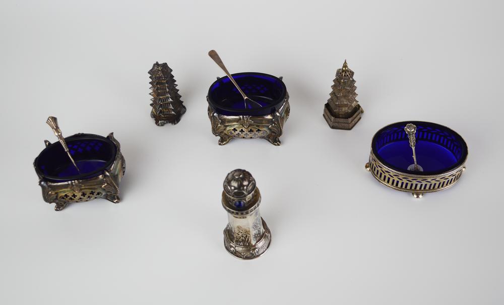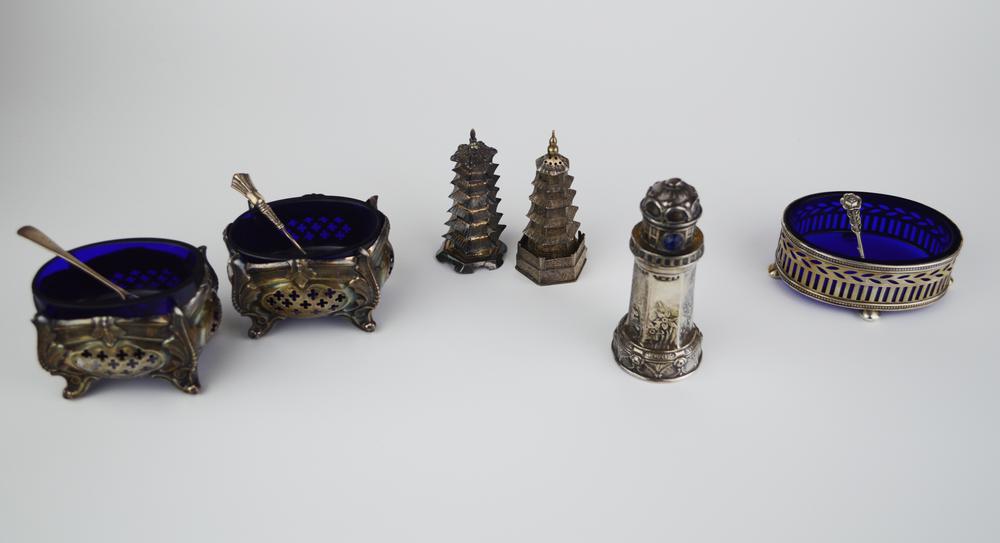 Coppia di saliere in argento a cestino sagomato e traforato, una ovale traforata con interni in vetro blu e cucchiaini. Due saliere orientali in argento modellate a torretta ed un contenitore modellato a faro francese. Europa e oriente sec. XX g 171 (6)