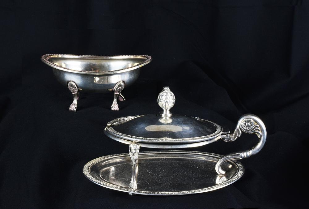 LOTTO COMPOSTO DA SALIERA E FORMAGGERA IN ARGENTO IN STILE IMPERO gr 254 mancanze