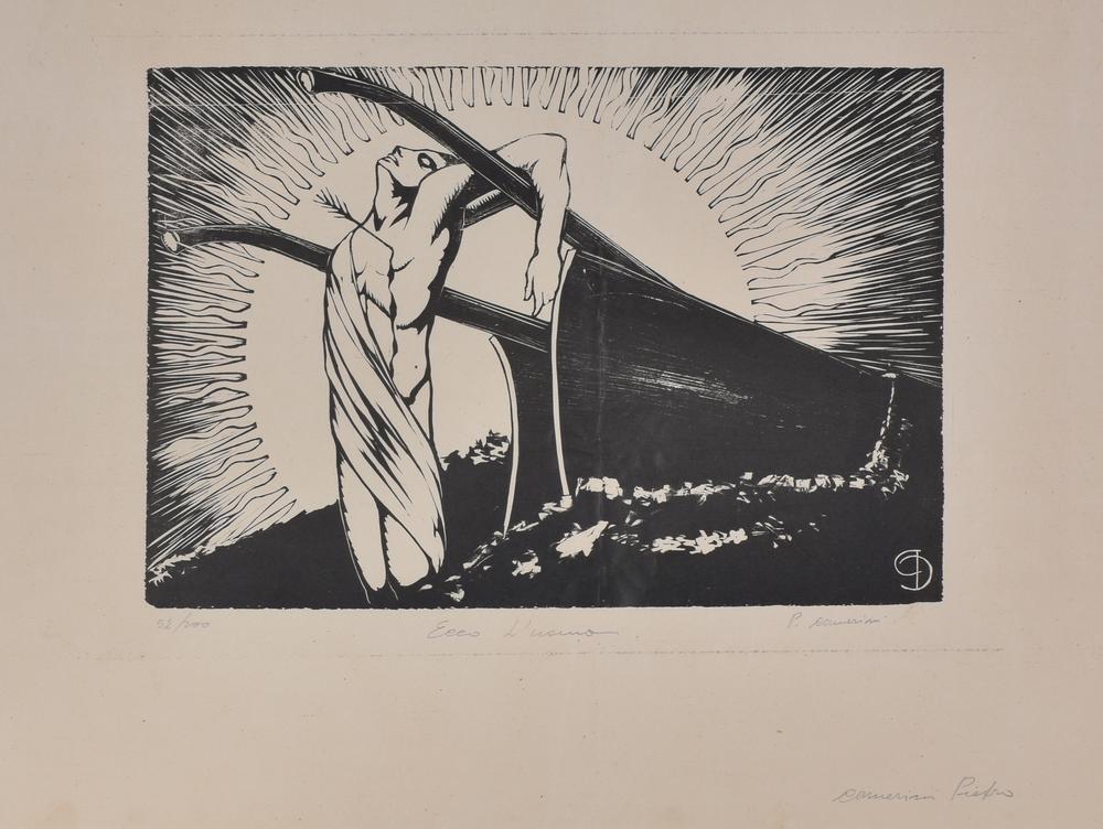 Paolo Camerini ECCO L’UOMO Xilografia. mm 205x305. Foglio: 340x407 Firmata a matita, titolata e numerata “52/200” Grandi margini. Minimi difetti marginali.