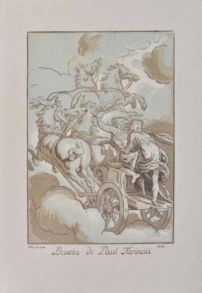 Nicolas Le Sueur DUE INCISIONI Il carro del sole. Xilografia a quattro legni....