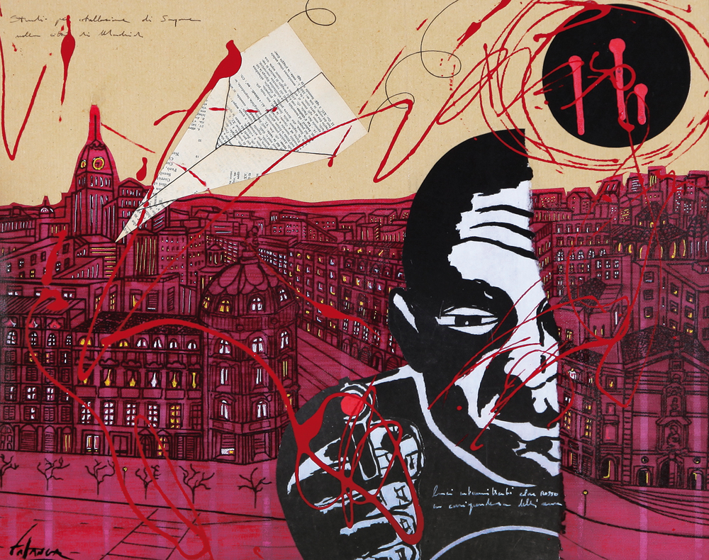 DANIELE FALANGA Messina 30/01/1974 Studio per installazione di sagome a Madrid, 2009 tecnica mista (acrilico, smalti e collage) su tela cm. 40x50, firma in basso a sinistra, titolo in alto a sinistra, firma, titolo e anno al retro, dichiarazione d'autenticità dell'artista su foto, fotografie ritraente l'artista e l'opera allegata, cd dove l'opera è pubblicata allegato.