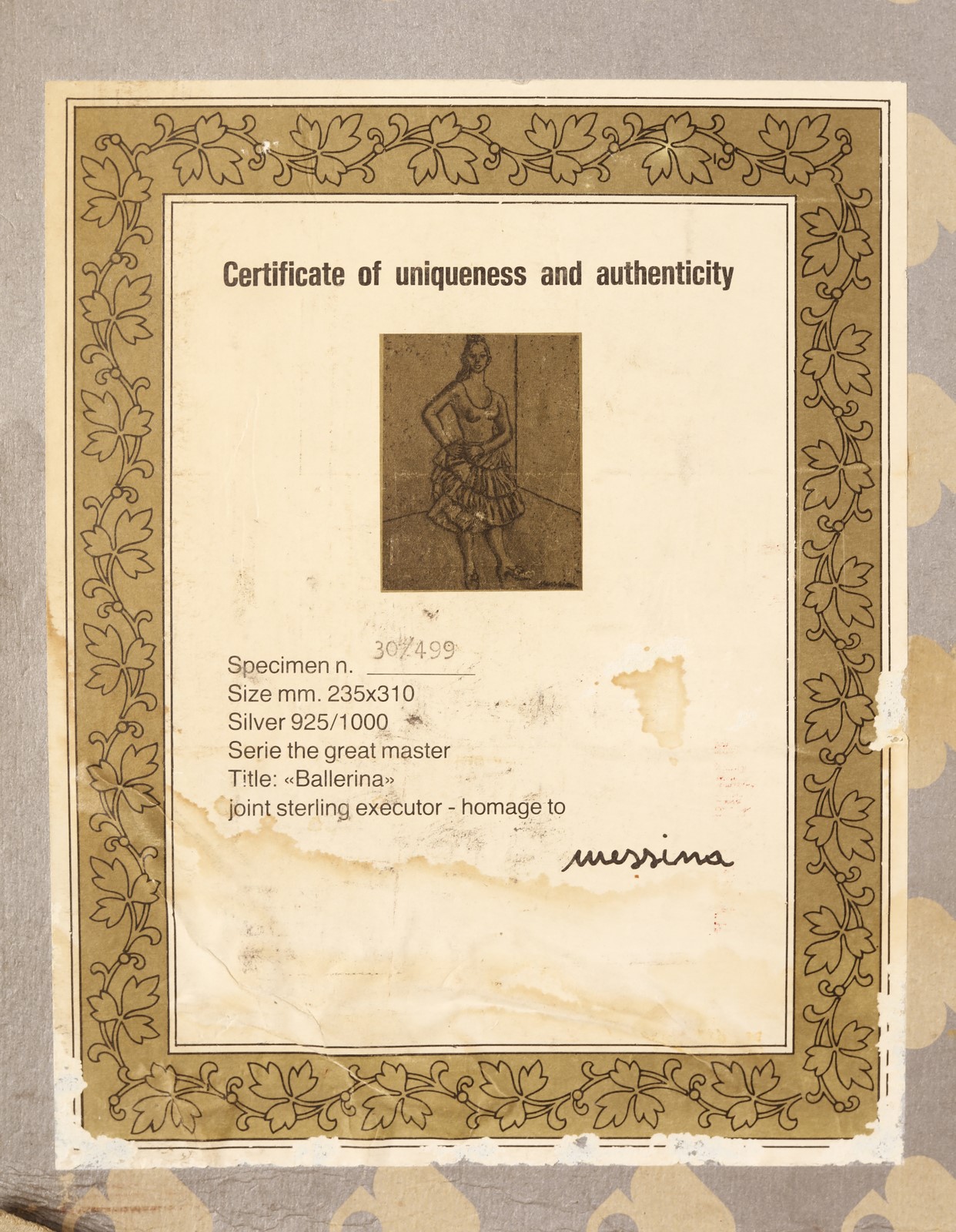 MESSINA FRANCESCO (1900 - 1995) Dancer. bas-relief on silver plate. Cm 23,50 x 31,00. 30/499. Edition and signature engraved lower right. Cornice presente