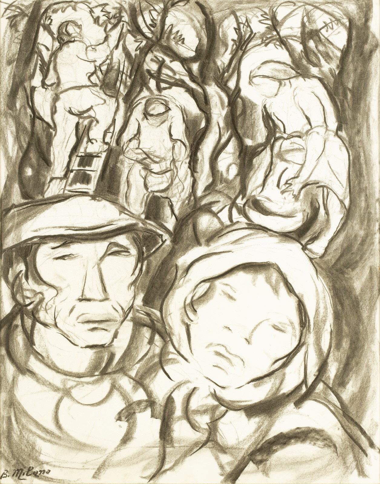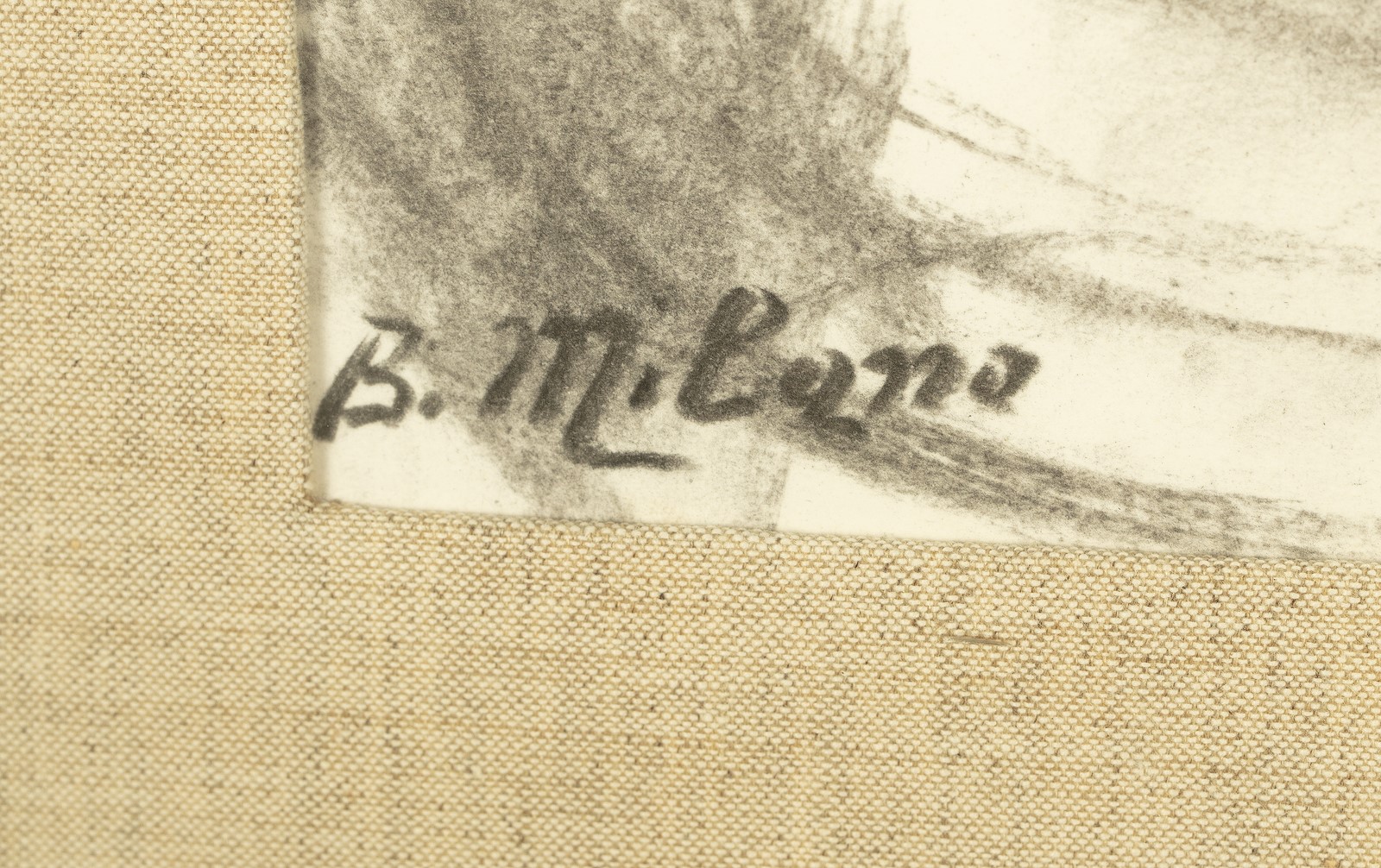 NON IDENTIFICATO AUTORE Senza titolo. Carboncino e pastelli su carta. Cm 52,00 x 64,00. Firma (B. Milano) in basso a sinistra. Cornice presente