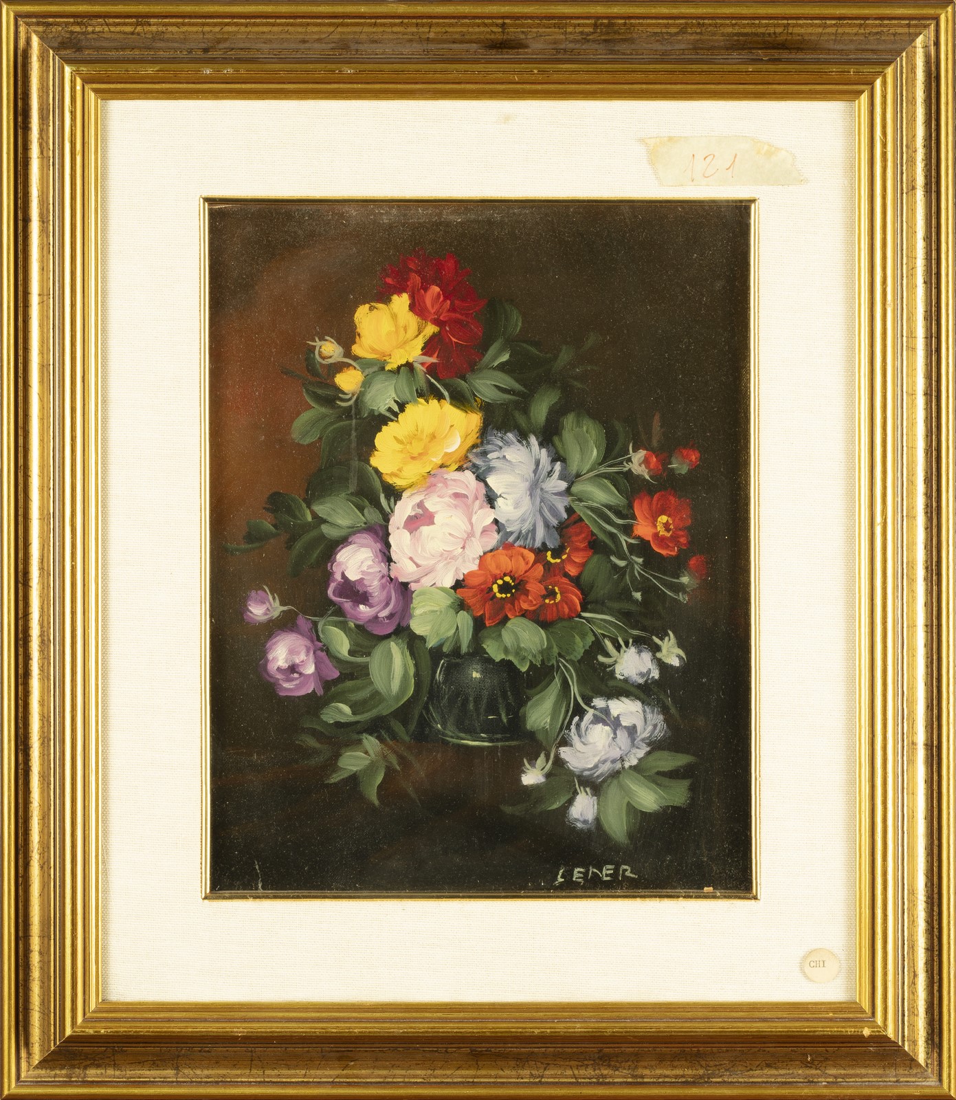 NON IDENTIFICATO AUTORE Flowers. Oil on canvas . Cm 24,00 x 30,00. Signature (E.Lener) lower right. At the back Il Castello Gallery, Adria label. Cornice presente