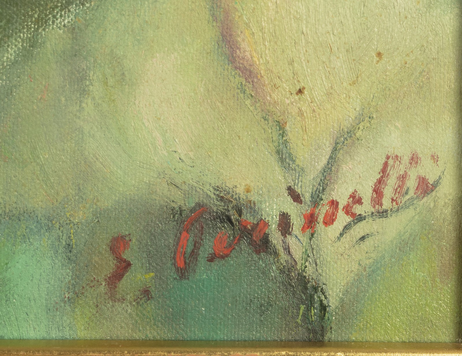 NON IDENTIFICATO AUTORE Cipressi a Gardone alto. Olio su tela . Cm 70,00 x 60,00. Firma (Elena Vermielli) in basso a destra. Firma e titolo al retro. . Cornice presente