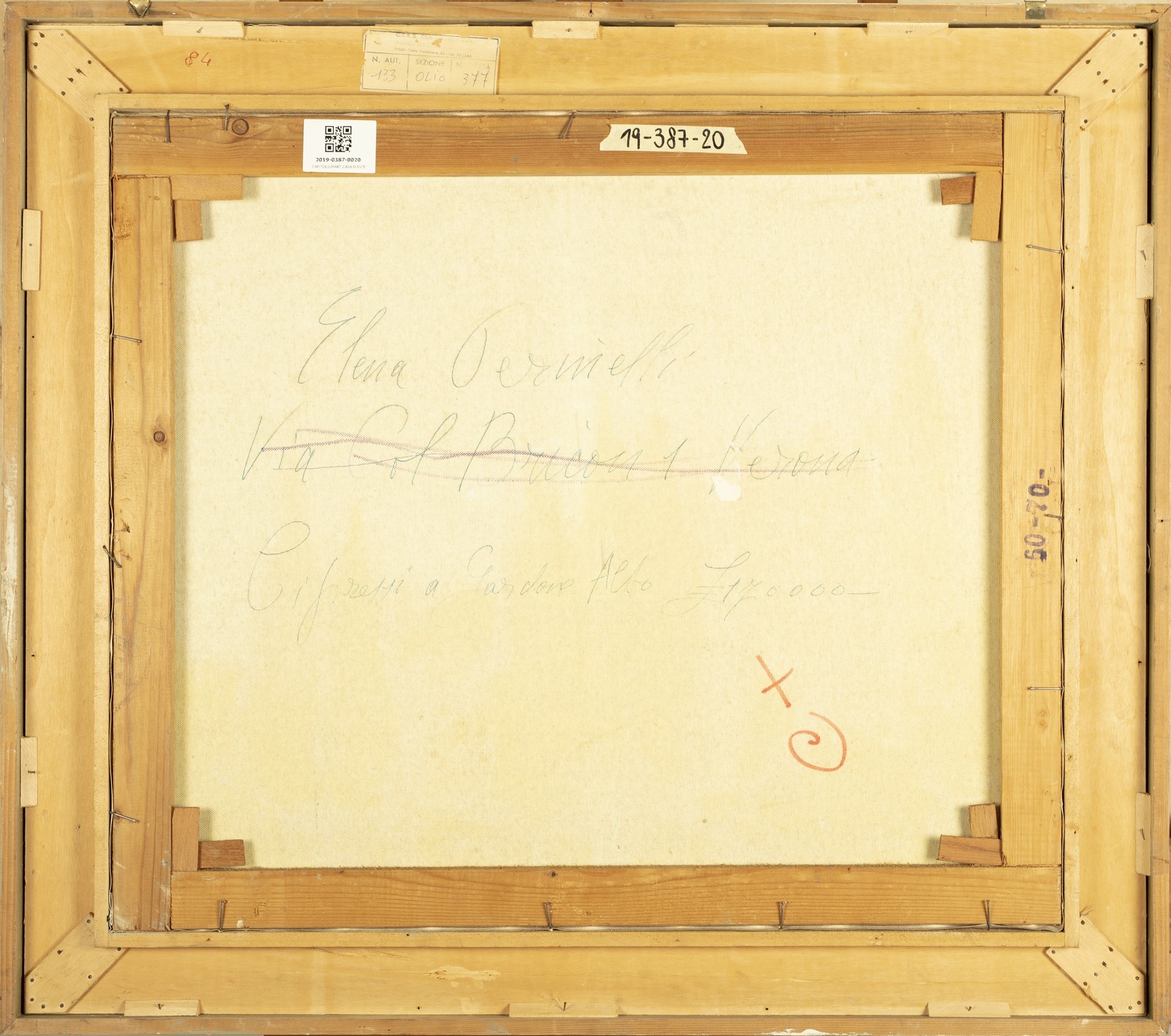 NON IDENTIFICATO AUTORE Untitled (Cipressi a Gardone alto). Oil on canvas . Cm 70,00 x 60,00. Signature (Elena Vernielli) lower right. Signature and title at the back.. Cornice presente