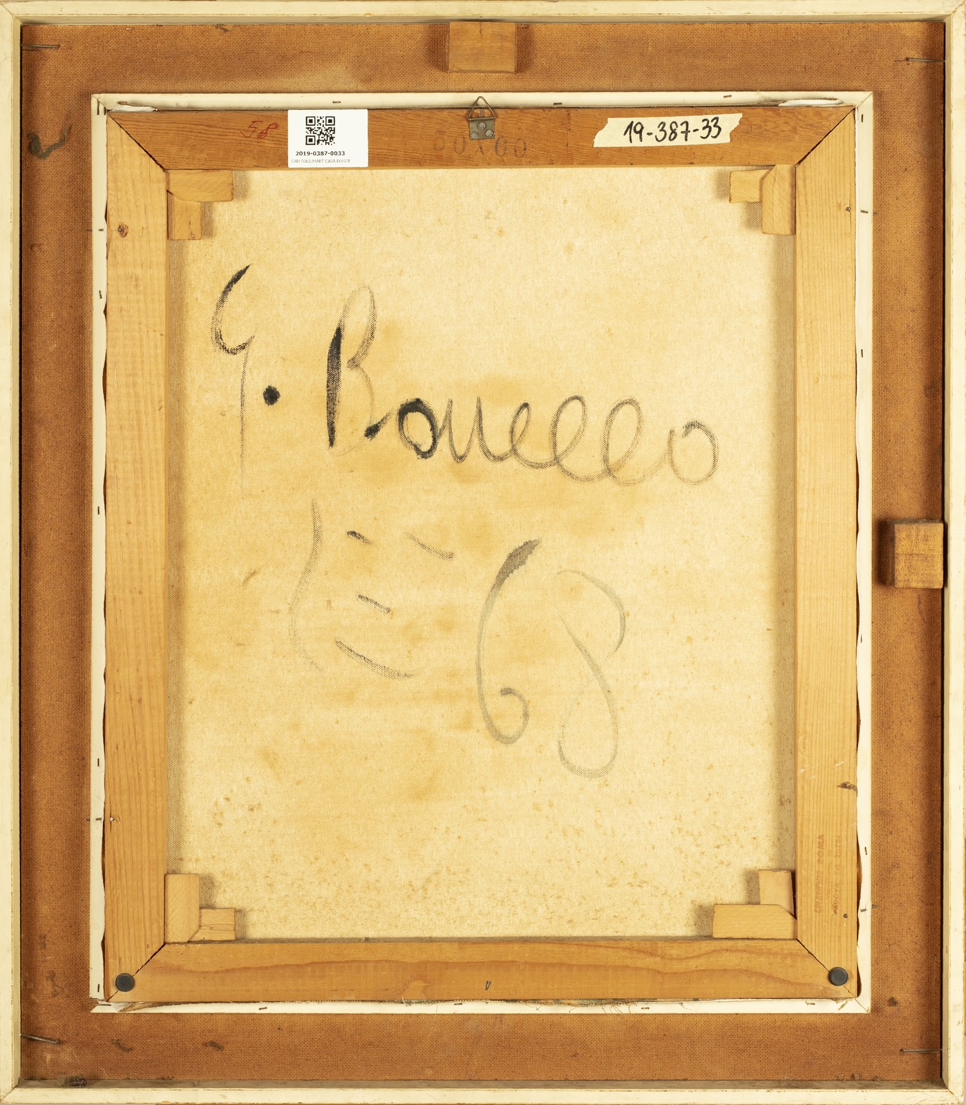 NON IDENTIFICATO AUTORE Untitled. 1968. Oil on canvas . Cm 50,00 x 60,00. Signature (G. Bonello) lower right. At the back signature and year.. Cornice presente