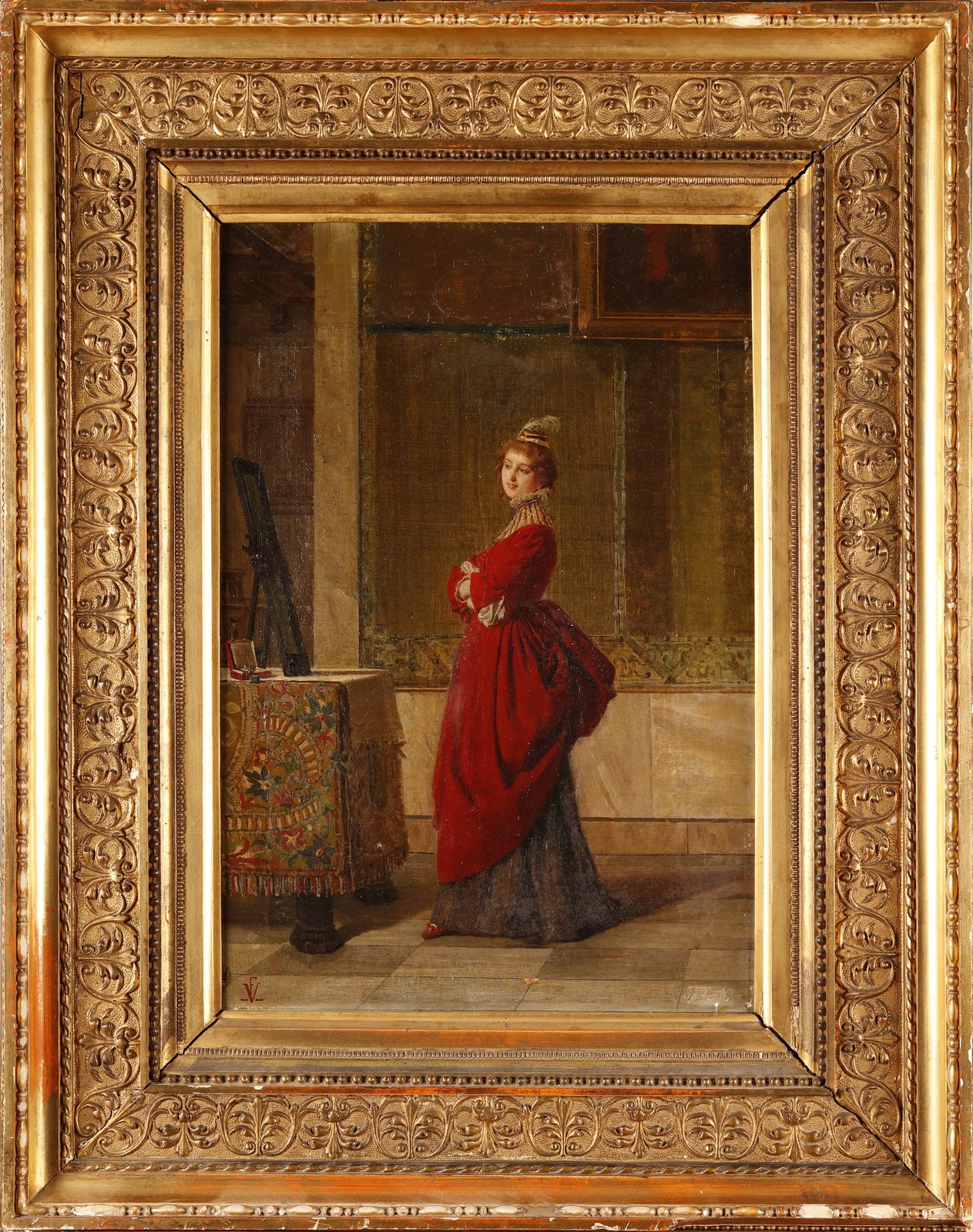 NON IDENTIFICATO AUTORE Dama in rosso. Olio su tela . Cm 32,50 x 47,00. . Cornice presente