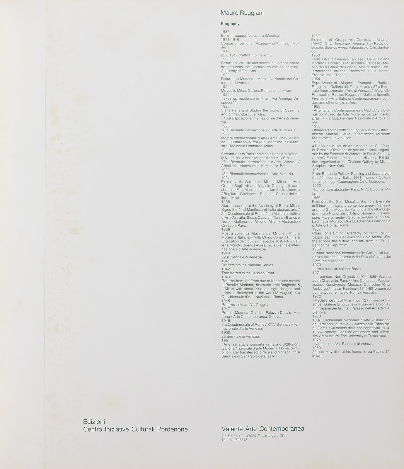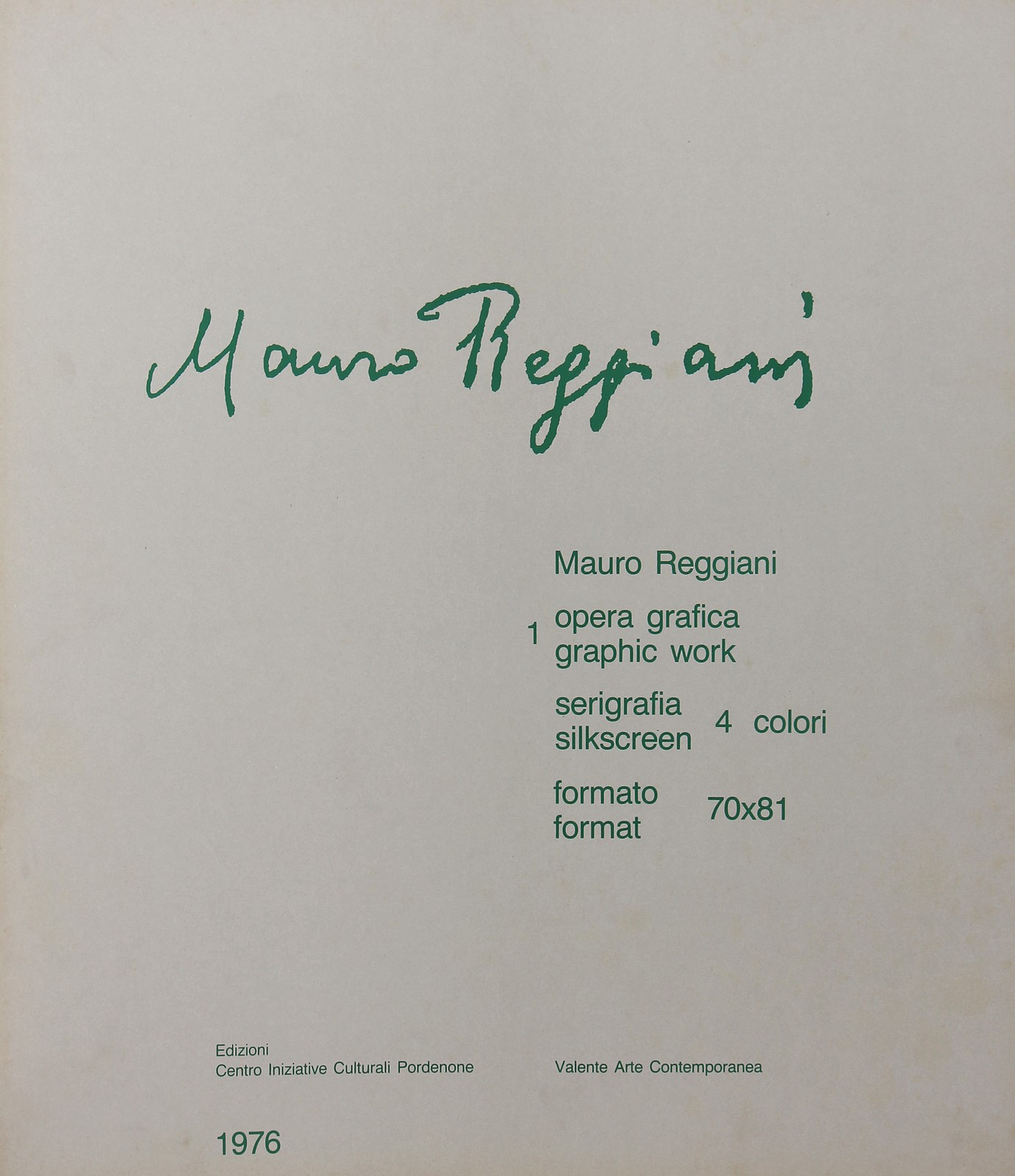 REGGIANI MAURO (1897 - 1980) Mauro Reggiani (folder). 1976. Silkscreen. Cm 70,00 x 81,00. 60/125. Edition and signature lower in pencil. Centro Iniziative Culturali, Pordenone Edition, Valente Contemporary art. Small defects.