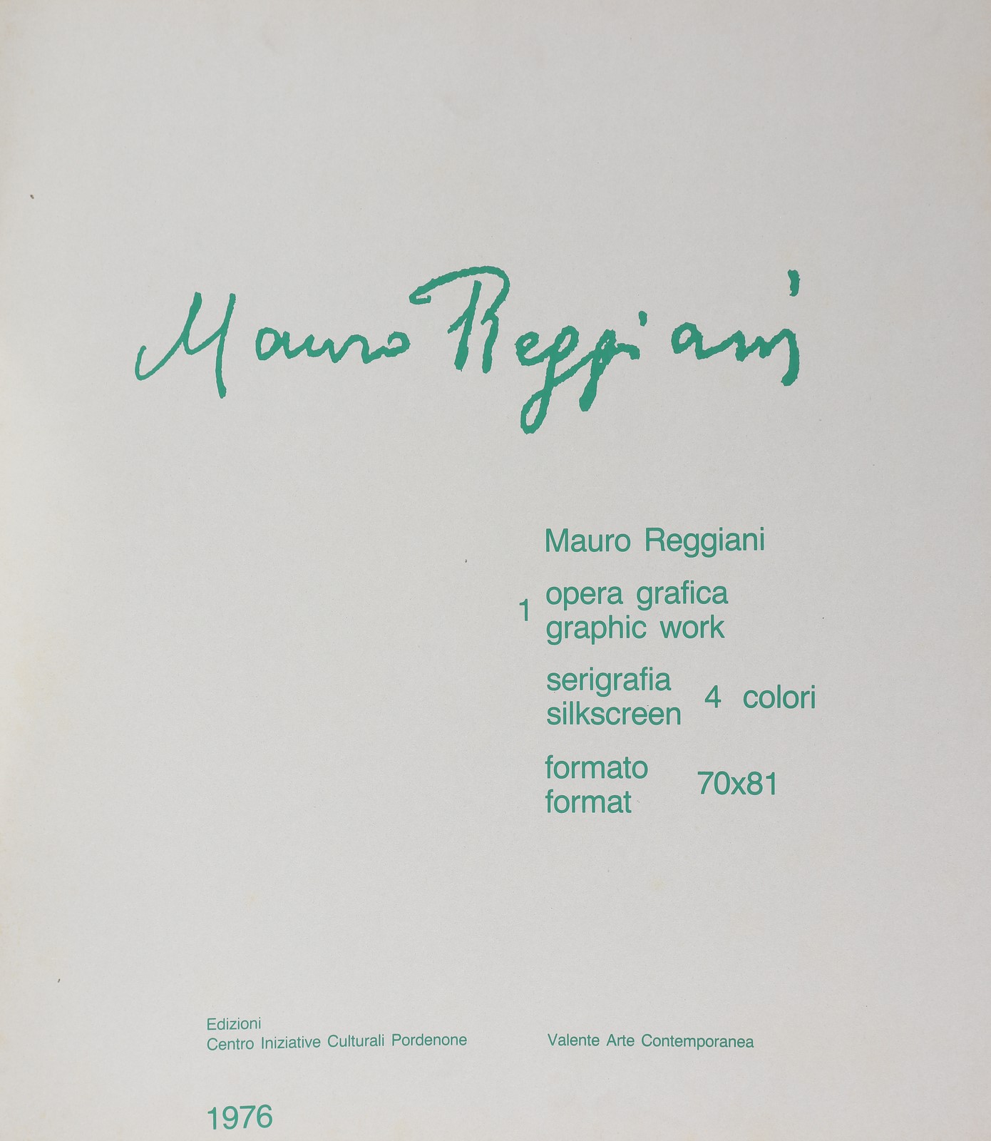 REGGIANI MAURO (1897 - 1980) Mauro Reggiani (cartella). 1976. Serigrafia. Cm 70,00 x 81,00. 89/125. Tiratura e firma a matita in basso. Edizioni Centro Iniziative Culturali Pordenone, Valente Arte Contemporanea.