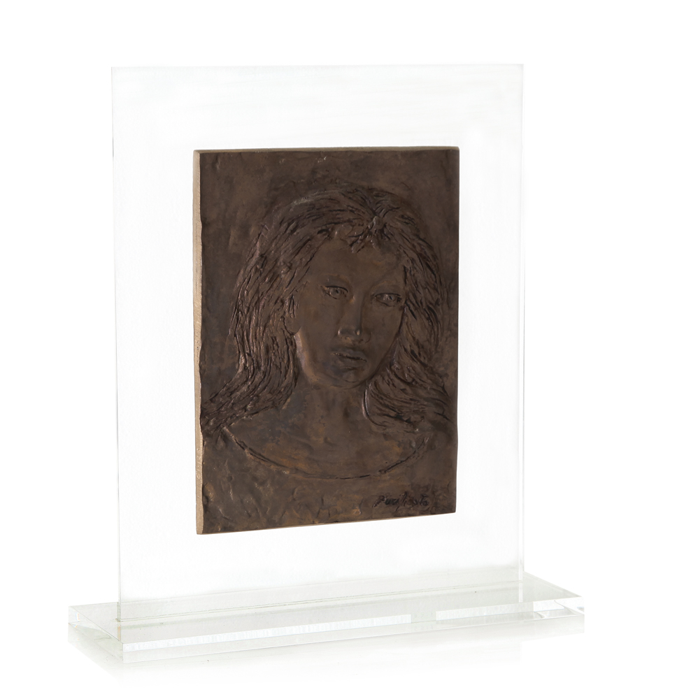DOMENICO PURIFICATO Fondi (Lt) 14/03/1915 - Fondi (Lt) 06/11/1984 Volto scultura a bassorilievo in bronzo cm. 29x21,5; poggiante su supporto in plexiglass, esemplare 61/125, firma in basso a destra.